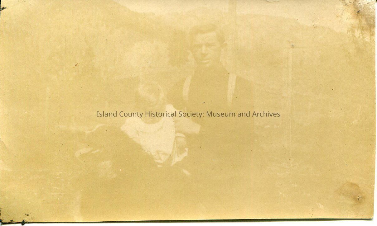 A black and white photo of a man, a baby and a dog. The man is wearng a dark-colored shirt and suspenders and the baby is wearing a white shirt. There are mountains in the background. The back of the photo says, "Friederick and his father".