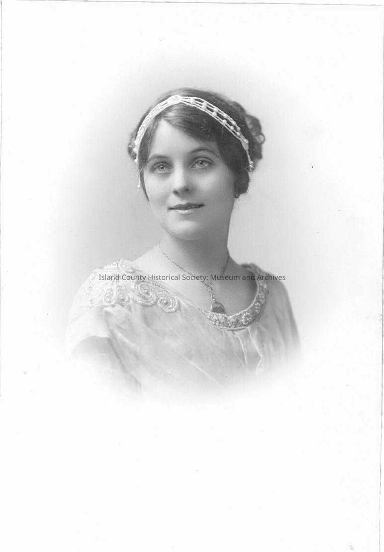 A photo of a woman. She is seated looking left but is facing right along her shoulder. She is wearing a scooped necked lacy top with a beaded border and shoulder cap. She has a necklave with a locket. He hair is up and she is wearing a beaded headband. Handwritten on the back is "Still,--Friend or relative found in Judge Still's file."