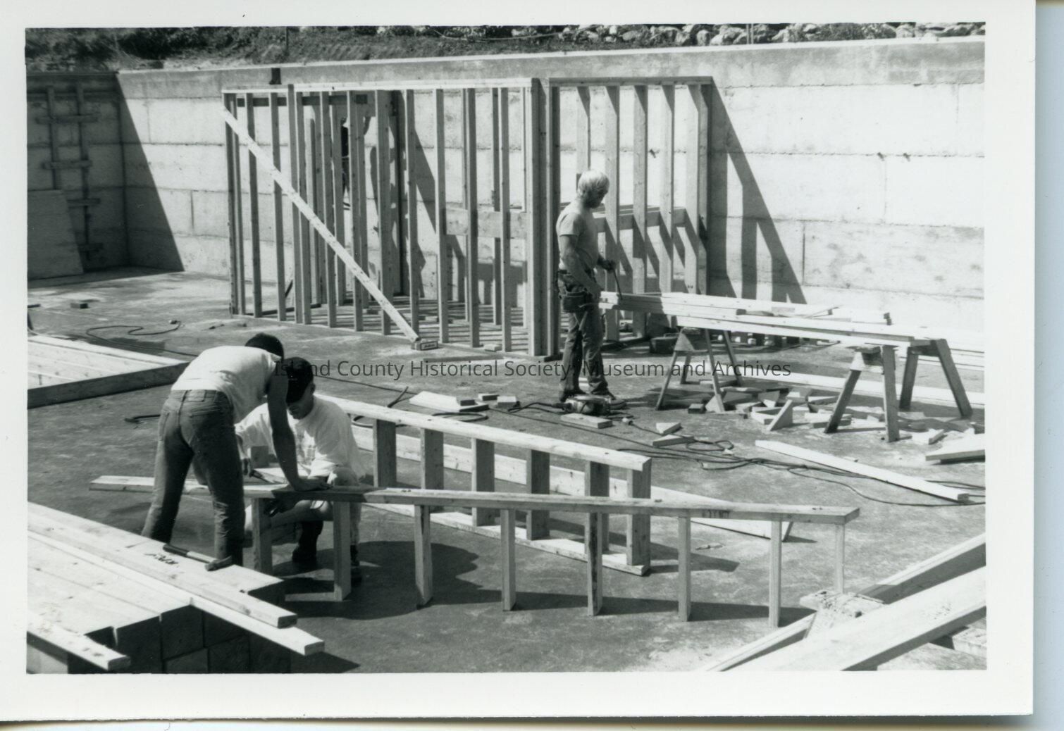 A photo of the basement of the new museum. Three workers are there building wooden frames for walls.