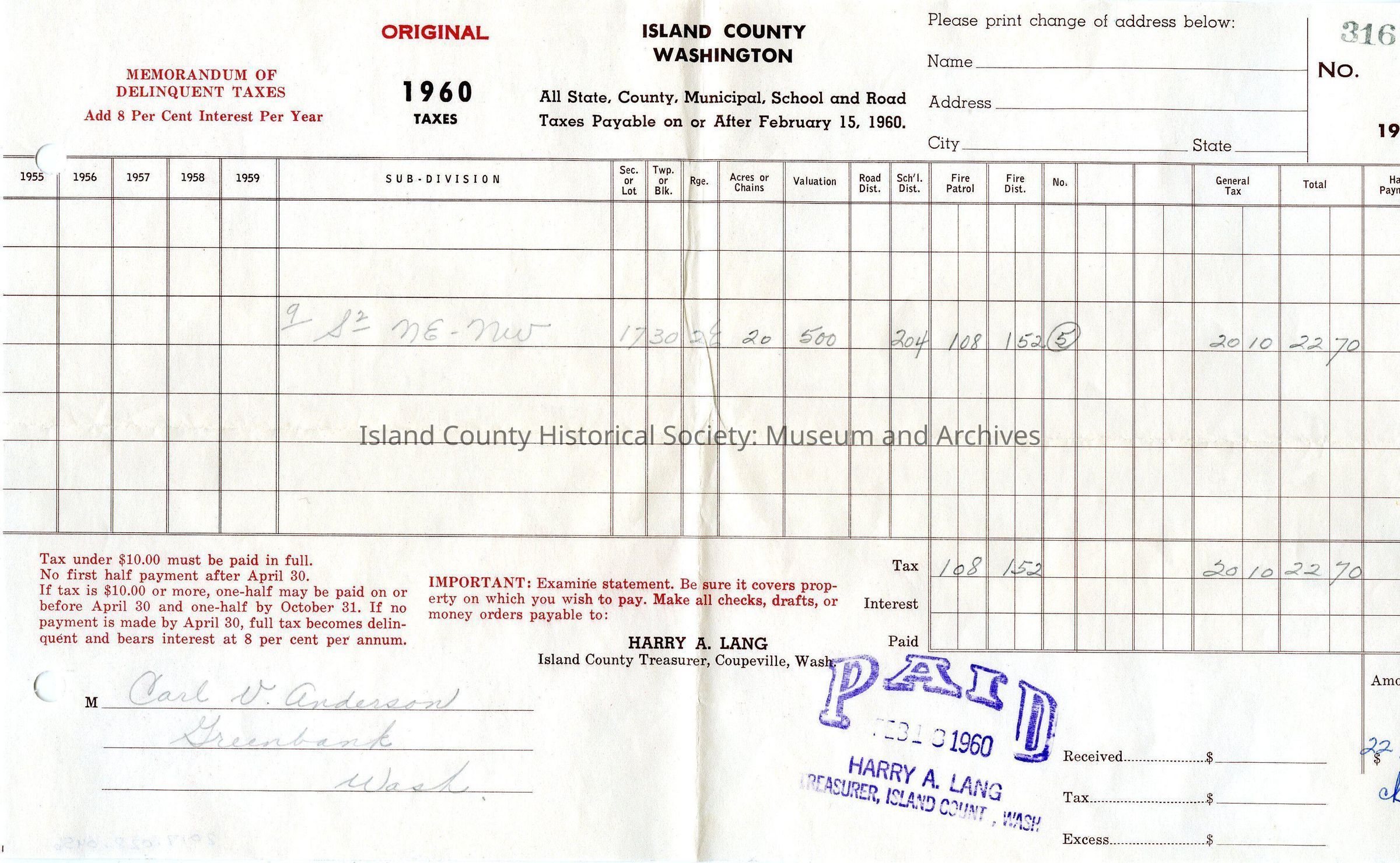 1960 Real Estate Taxes Island County statement addressed to Carl Anderson showing valuation of property, how much tax was owed and how it was split up amongst public services and stamped as paid February 18 1960