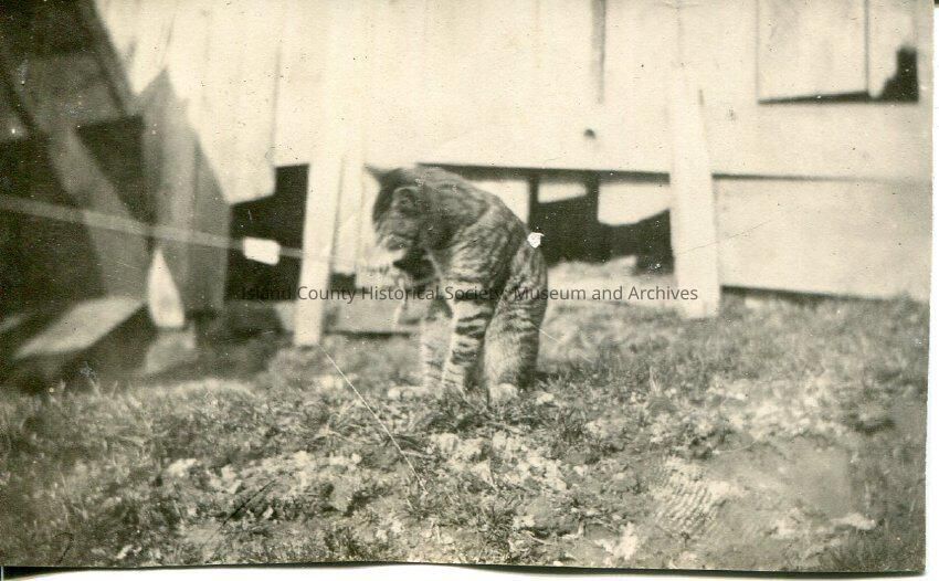 A black and white photo of a striped cat outside. The cat is licking one of it's paws. There is a house, barn or shed in the background.