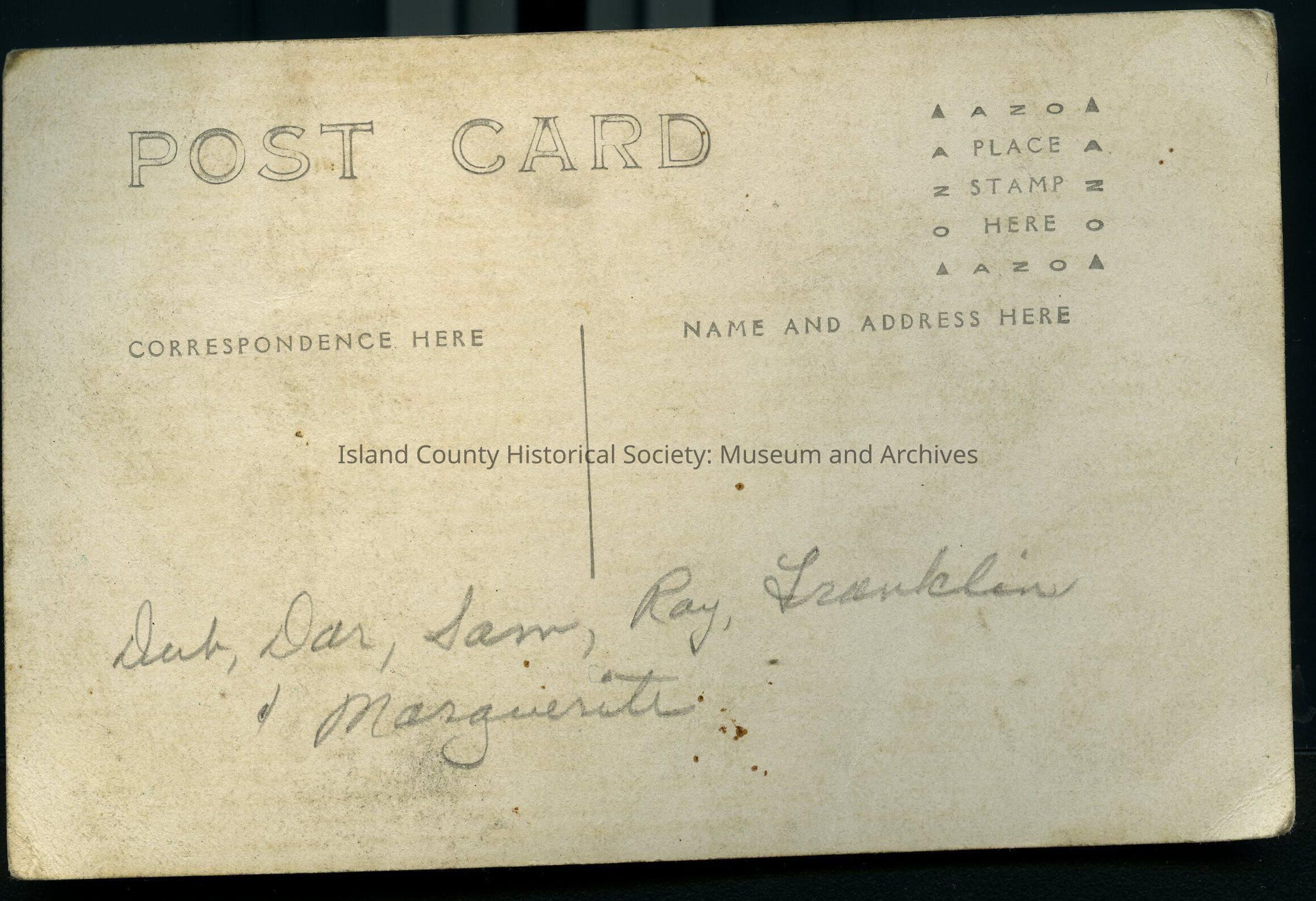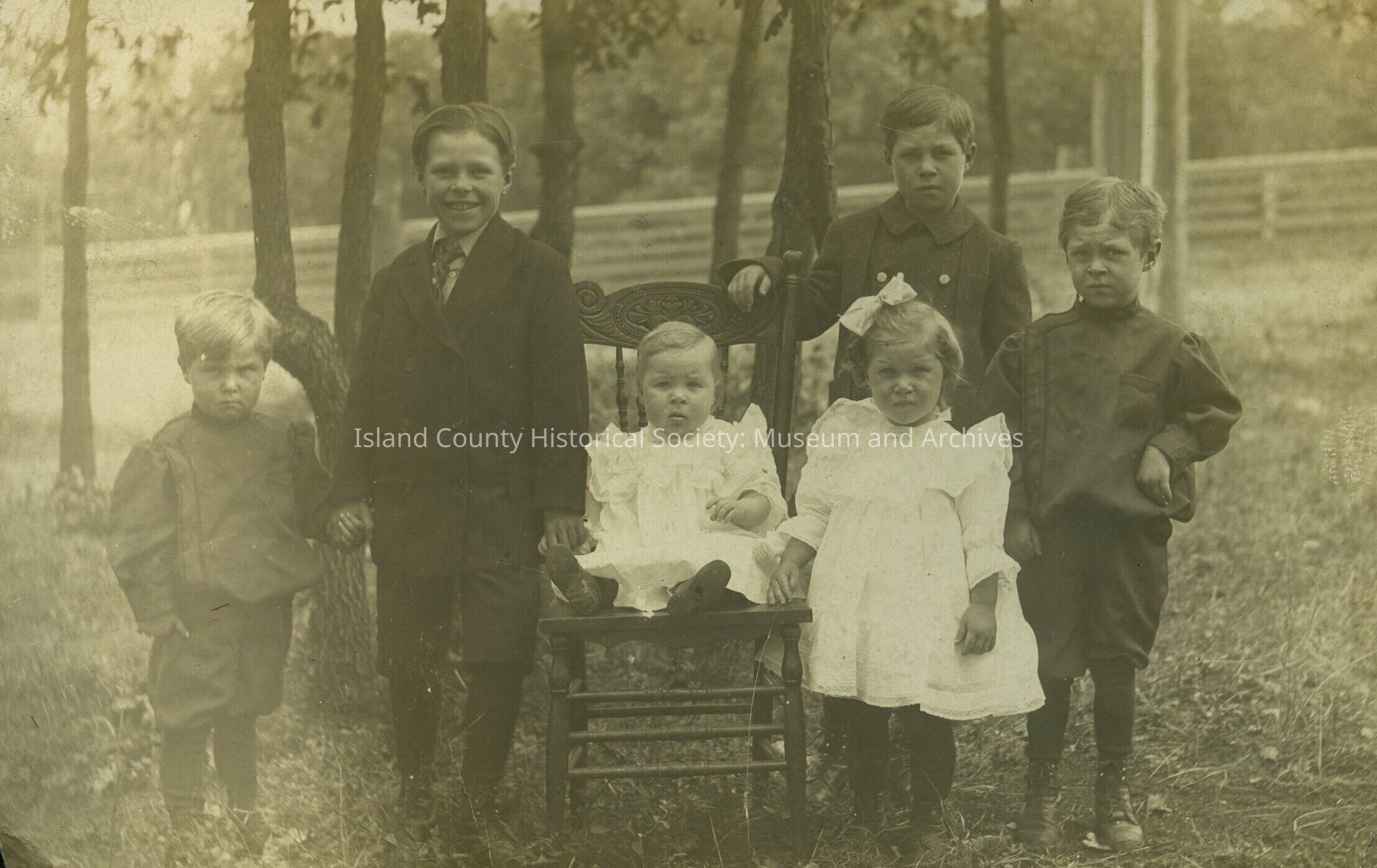 A postcard photo of six children. The back reads Dale, Dan, Sam, Ray, Franklin, and Marguerite.