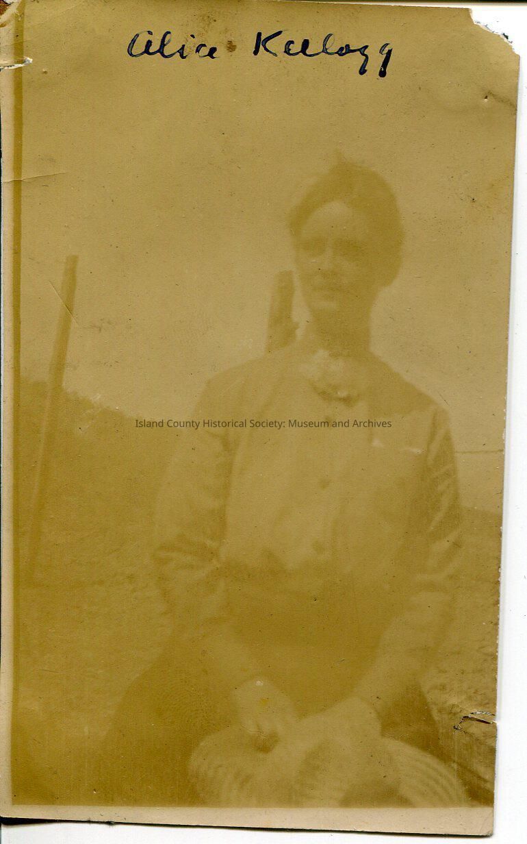 A black and white photo of a woman. It looks like she could possibly be horseback riding. She is wearing a blouse and skirt and has her hair pulled back. The top of the photo says, "Alice Kellogg". The back of the photo says something along the lines of "first we have had Alice... (the rest is unledgable)". Alice Kellogg Miller, later Cahail, is the eldest daughter of Albert Kellogg and Edith Dillon Kellogg, granddaughter of John Coe Kellogg and Caroline Terry Kellogg, buried at Sunnyside Cemetery.