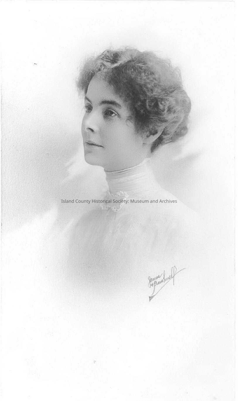 A sepia photo of a woman. She is postured and looking to her right. She has curly hair, a lacy highnecked blouse with a lacy bow at the neck. Handwritten on the back is "Still, Friend or Relative in Judge Still's file."