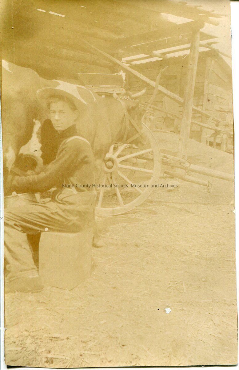 A black and white photo of a young man milking a cow. The man is wearing a cowboy hat and suspenders. There is a cow and wagon in the background. There is also a barn on the right-side of the photo in the background. The man is sitting on a block and has a metal bucket between his knees. The back of the photo says, "Billie milking his favorite cow".