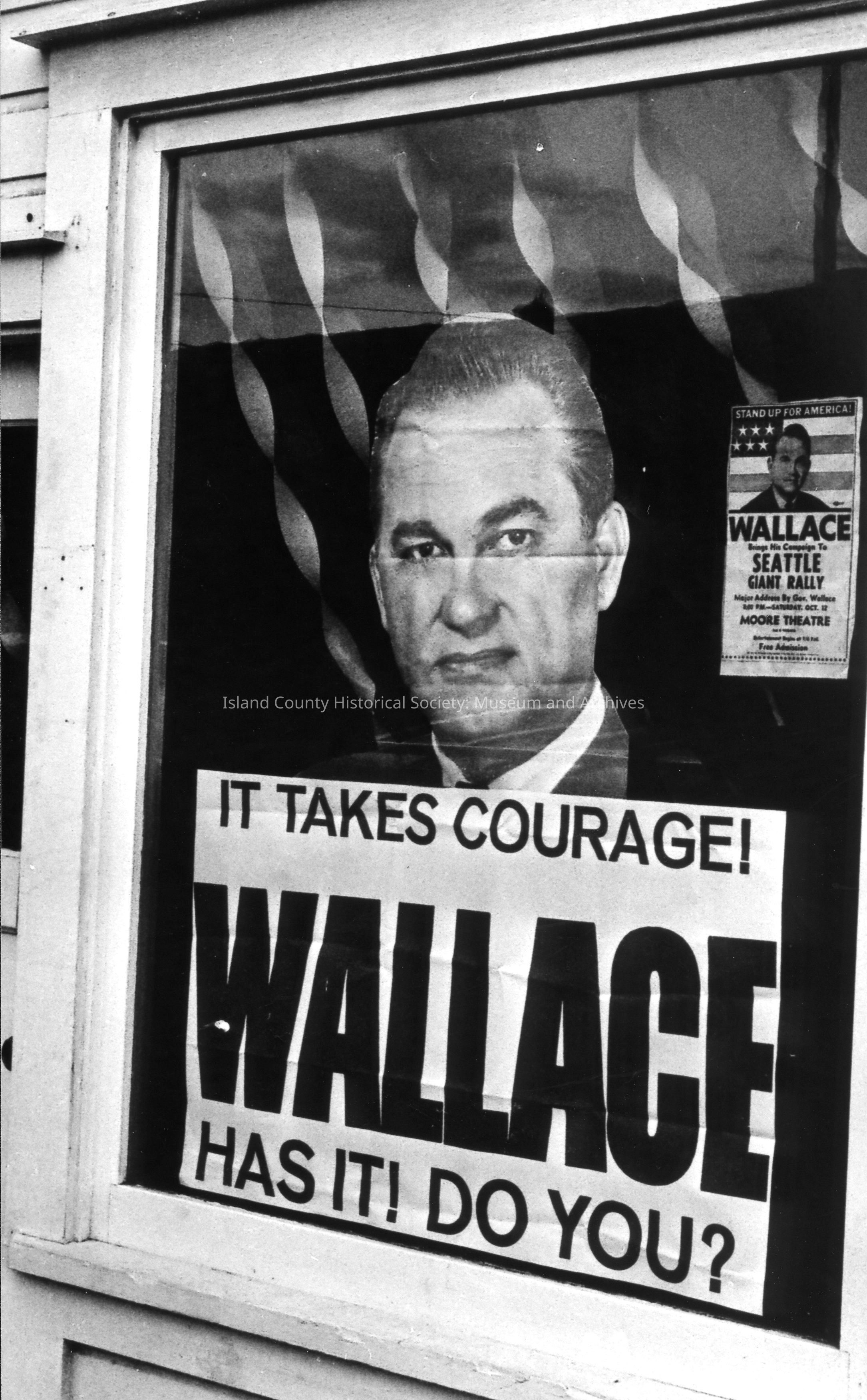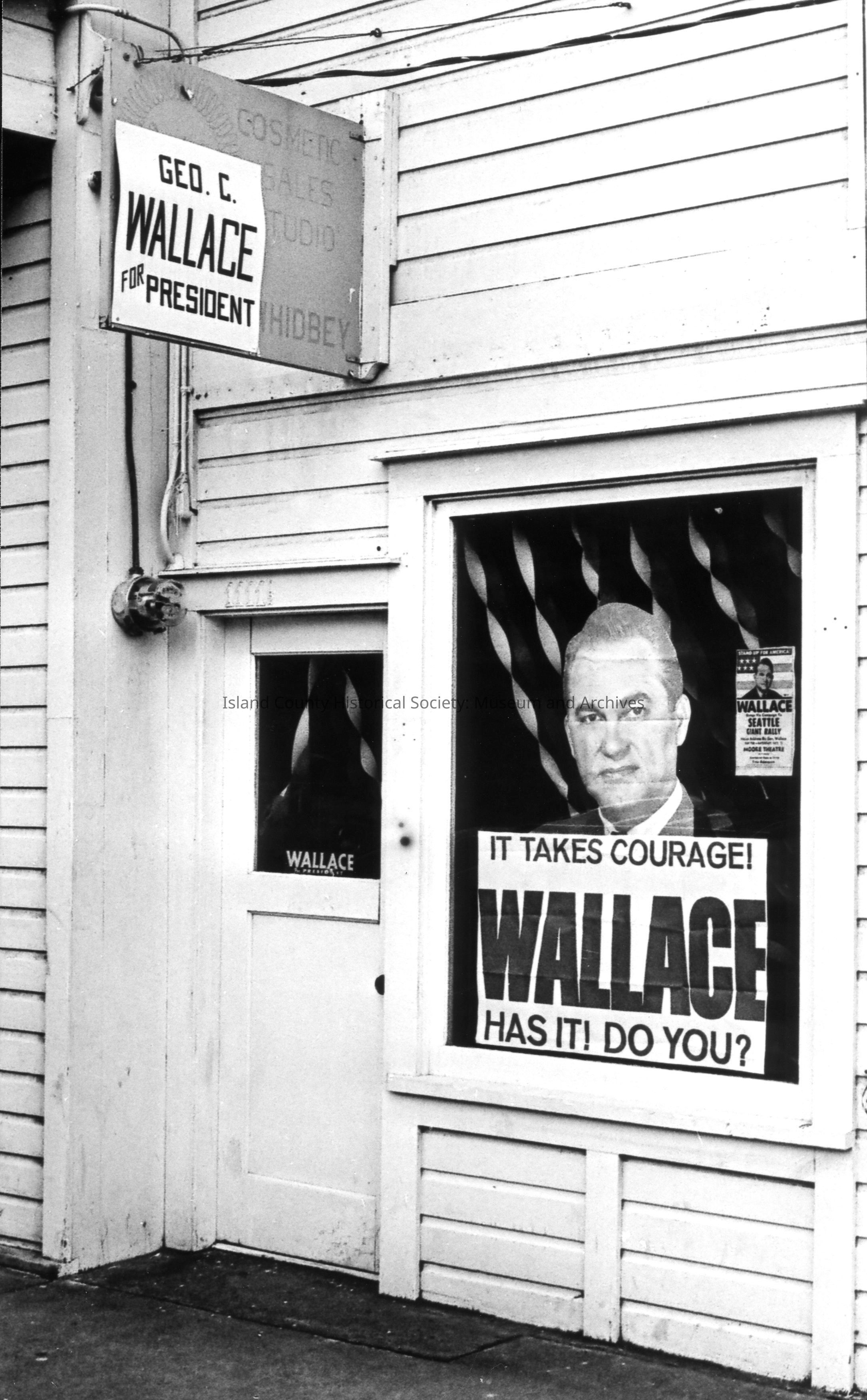 George Wallace for President Headquarters on Pioneer Way in 1968. Poster partially covers old sign for Cosmetic Sales Studio. A poster in the window reads: It takes courage! Wallace has it! Do you?Photograph Details