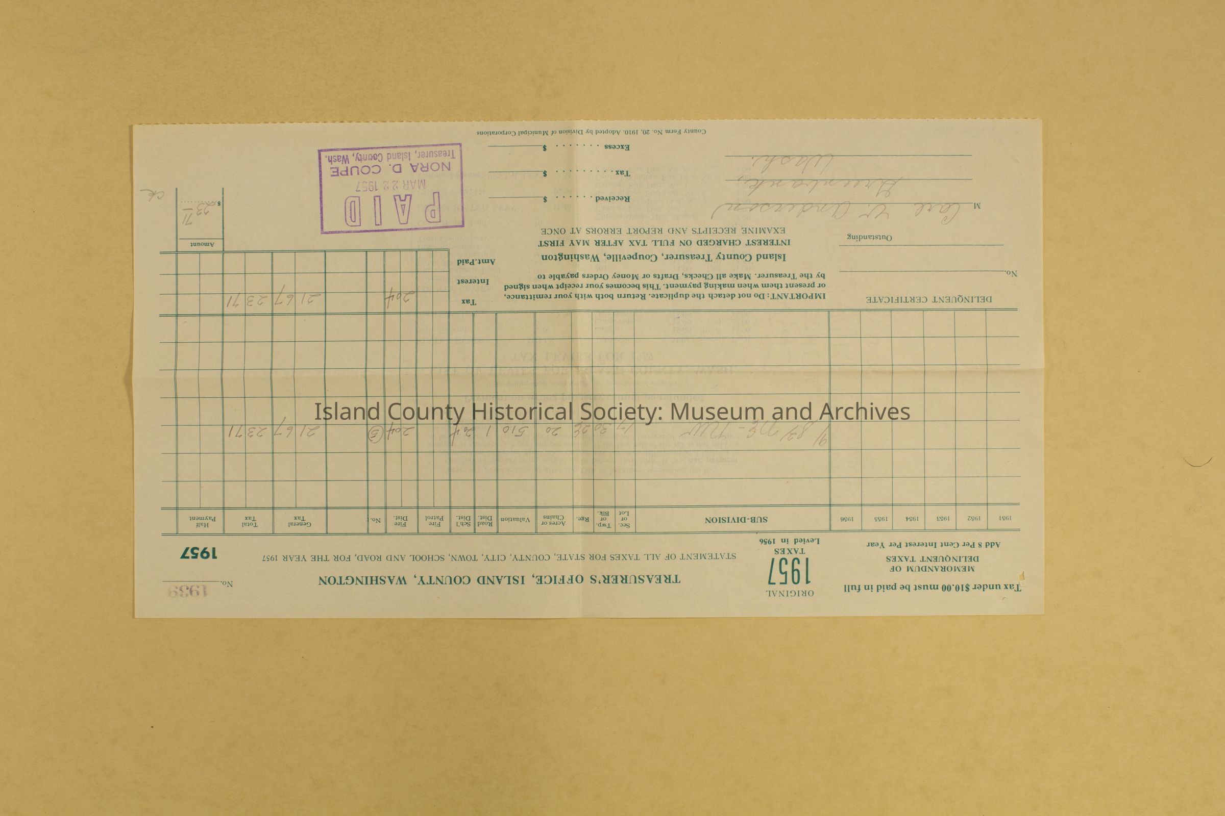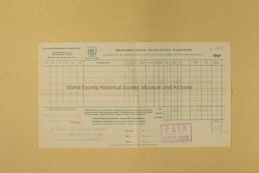 1957 tax statement from Island County Treasurer's Office noting how much tax was owed and how the tax is measured out amongst public services. Stamped as paid March 22 1957
