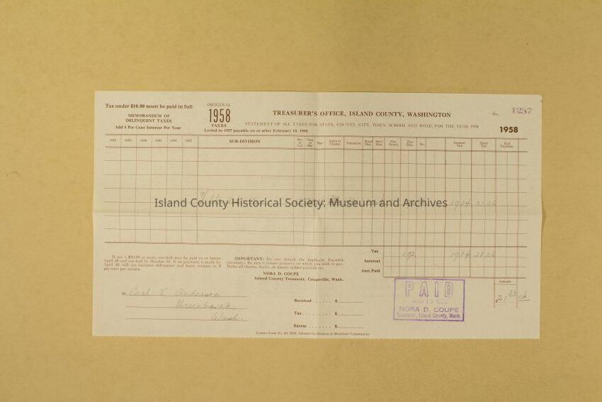 1958 Real Property Island County Tax statement addressed to Carl Anderson showing value of property, fire patrol, general and total tax owed and stamped as paid March 19 1958