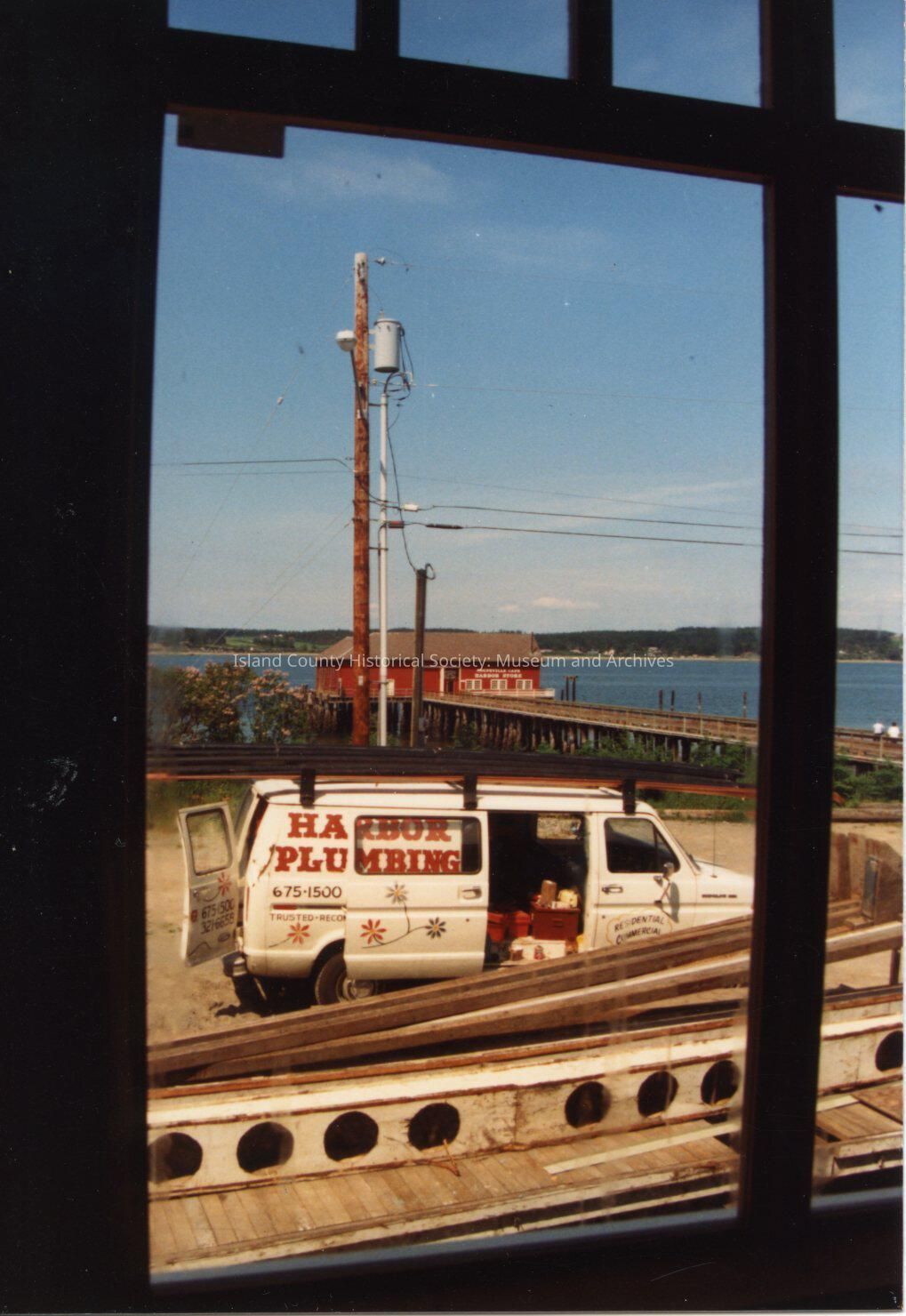 A photo of the museum looking at a van of Harbor Plumbing. The is the warf and dock and water in the background. This is a colored photo.