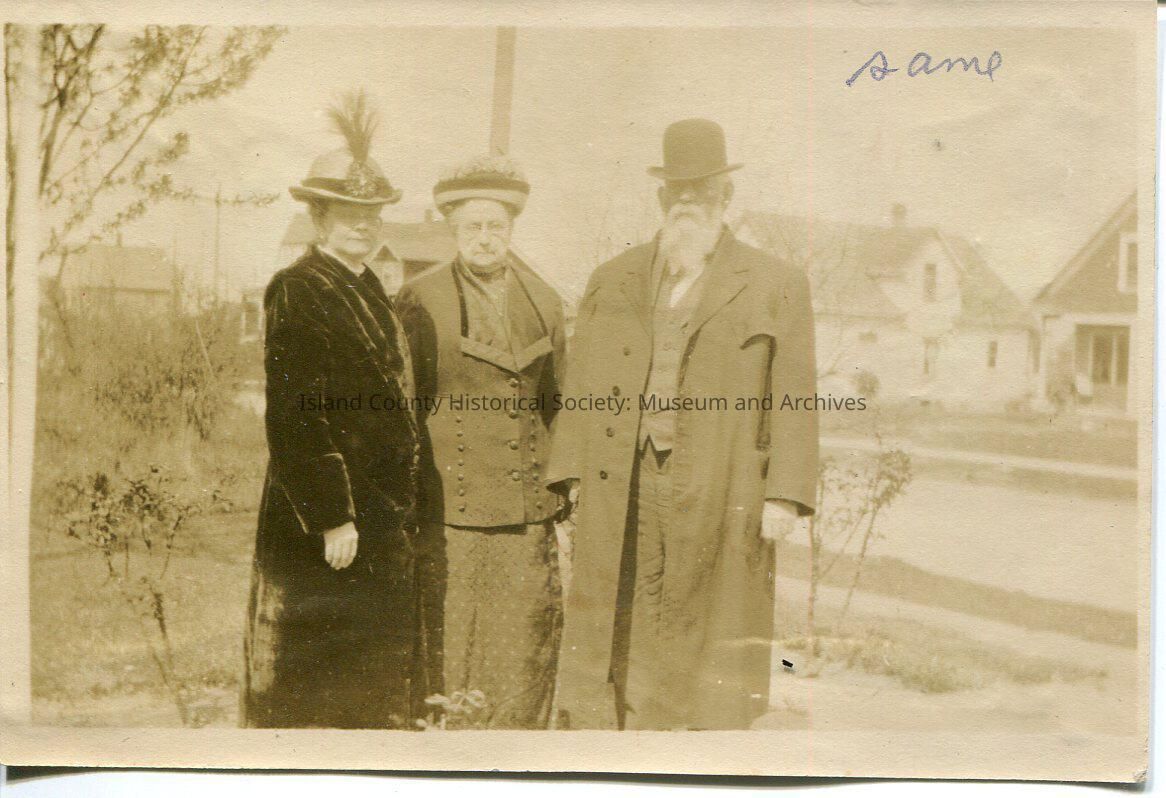 A photo of a group of three adults. There are two women and one man. The women are both wearing dresses or skirts and a coat over them. They also are both wearing hats and glasses. The man is wearing a tall hat, a suit and a jacket over the suit. He also has glasses. The top of the photo says, "same" which is referring to photo "2015.074.574" which says, "Mother, Grandmother and Grandpa Butters". Lillian Butters Kellogg, Oella Brown Butters, James McKeen Butters.Lexicon