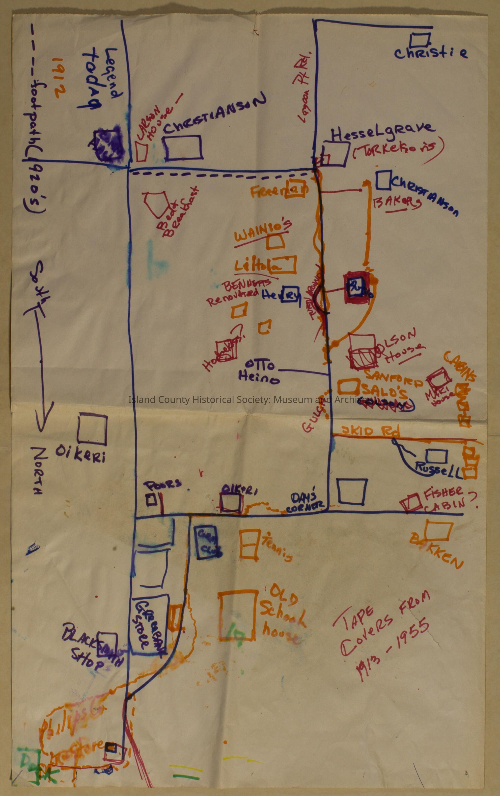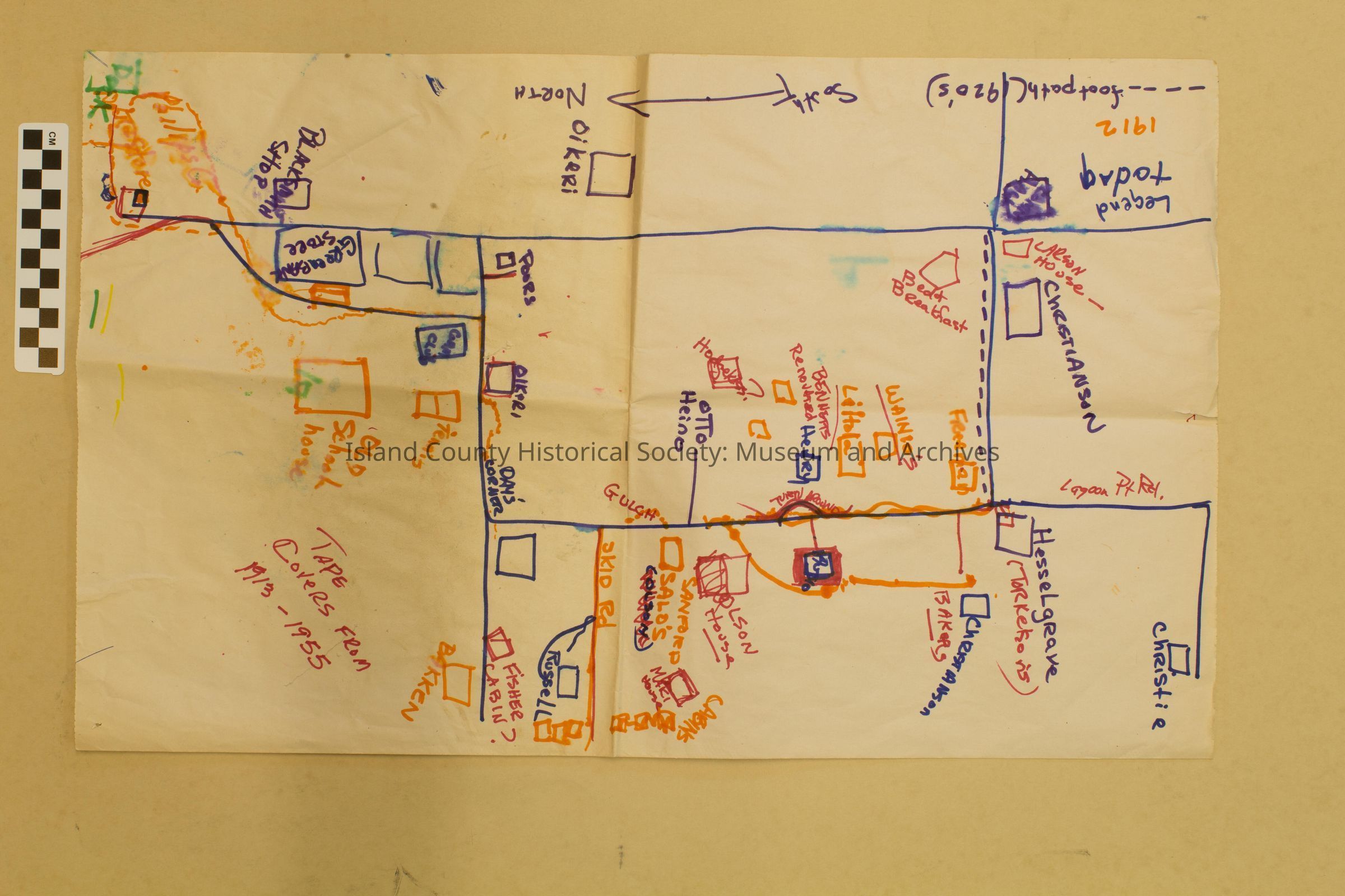 Hand-drawn map of portion of Whidbey Island; Greenbank area. Red, blue and orange felt tips used to sketch out approx. where Nordic families resided in relation to each other in Greenbank during the early 1900s. Includes names of families/persons, road names and other well-known buildings in the vicinity.