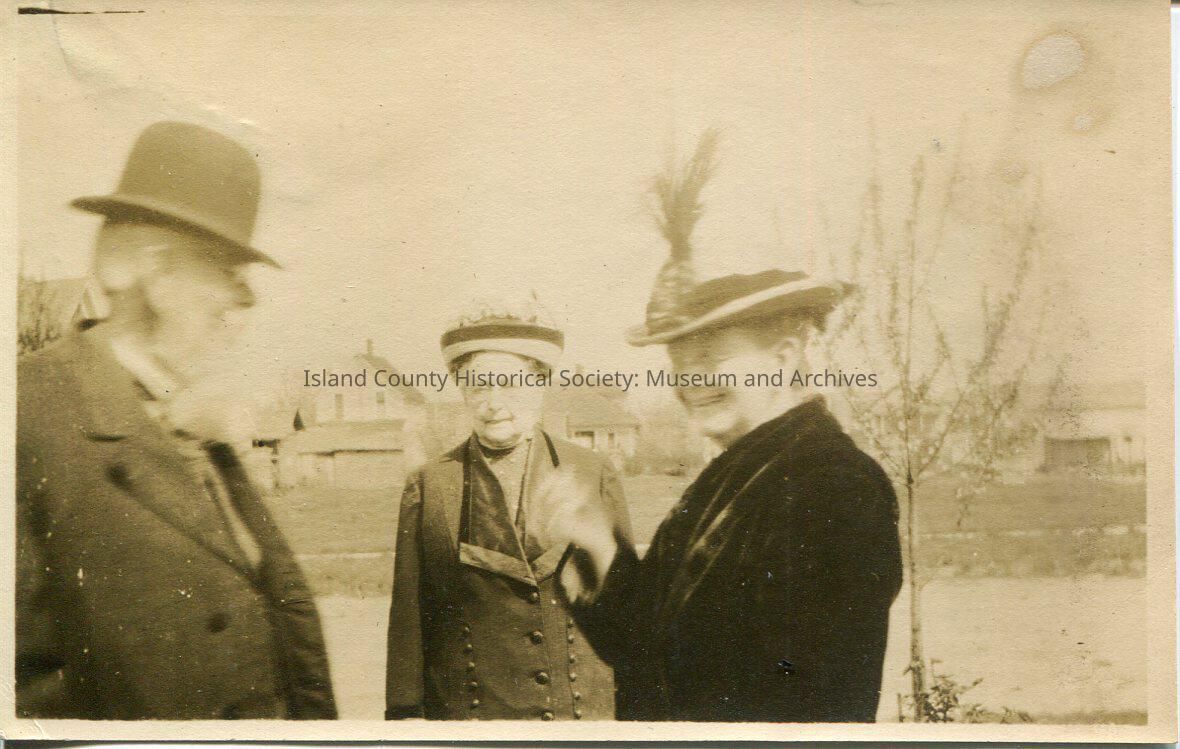 A photo of a group of three adults. There are two women and one man. The women are wearing hats, glasses and coats. The man is also wearing a hat, glasses, and a coat over his suit. The man has a white beard. They are standing in a circle and they are smiling. The photo is candid and blurry. There are houses in the background. Lillian Butters Kellogg, Oella Brown Butters, James McKeen Butters.Lexicon