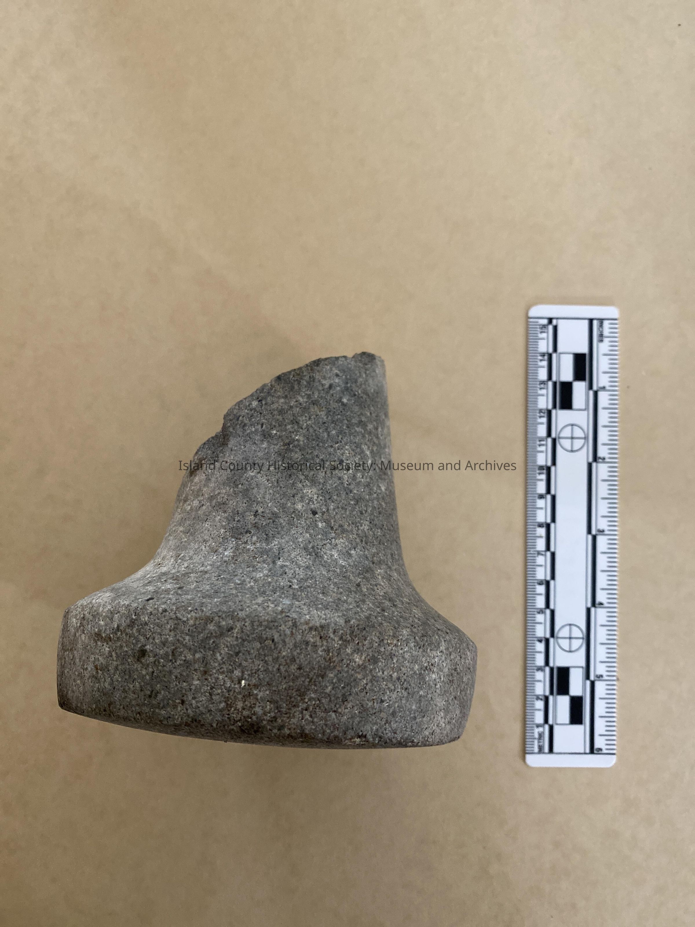 Stone hammer, circular base, slopes upward into probabal handal, grey in color.