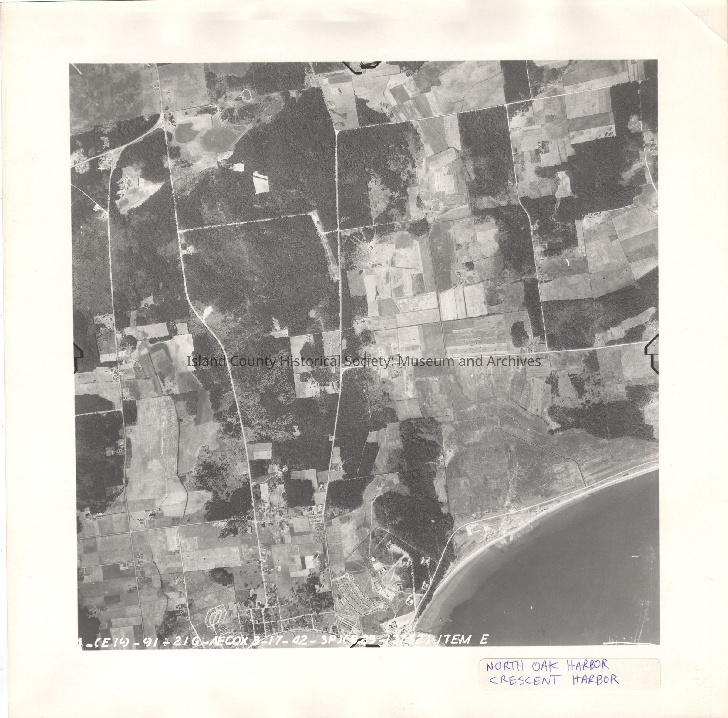 Donated by Island Conservation Adjacent to 2015.023.219 14 (E19-91-21G-AEC0)(8-17-42-3P)(825-13752) ITEM E Photo taken 17 August 1942 Label in ink: North Oak Harbor Crescent Harbor Pencil X in the center See GIS for digital copies.