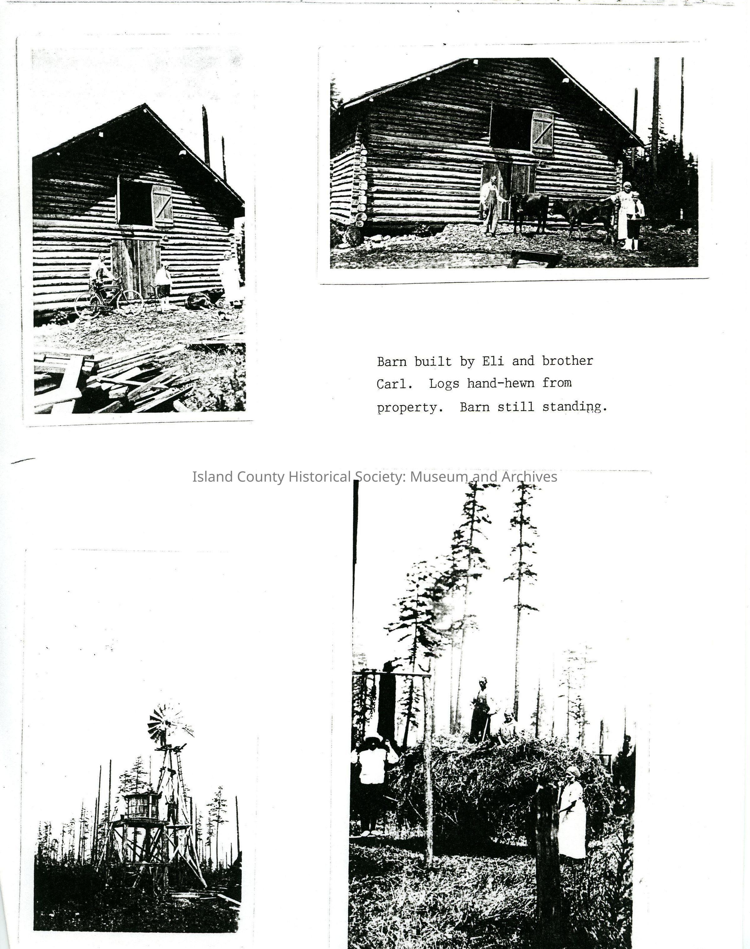 Photocopy of page with four photographs with one small captions. Includes barn built by Eli and Carl Anderson and a windmill.
