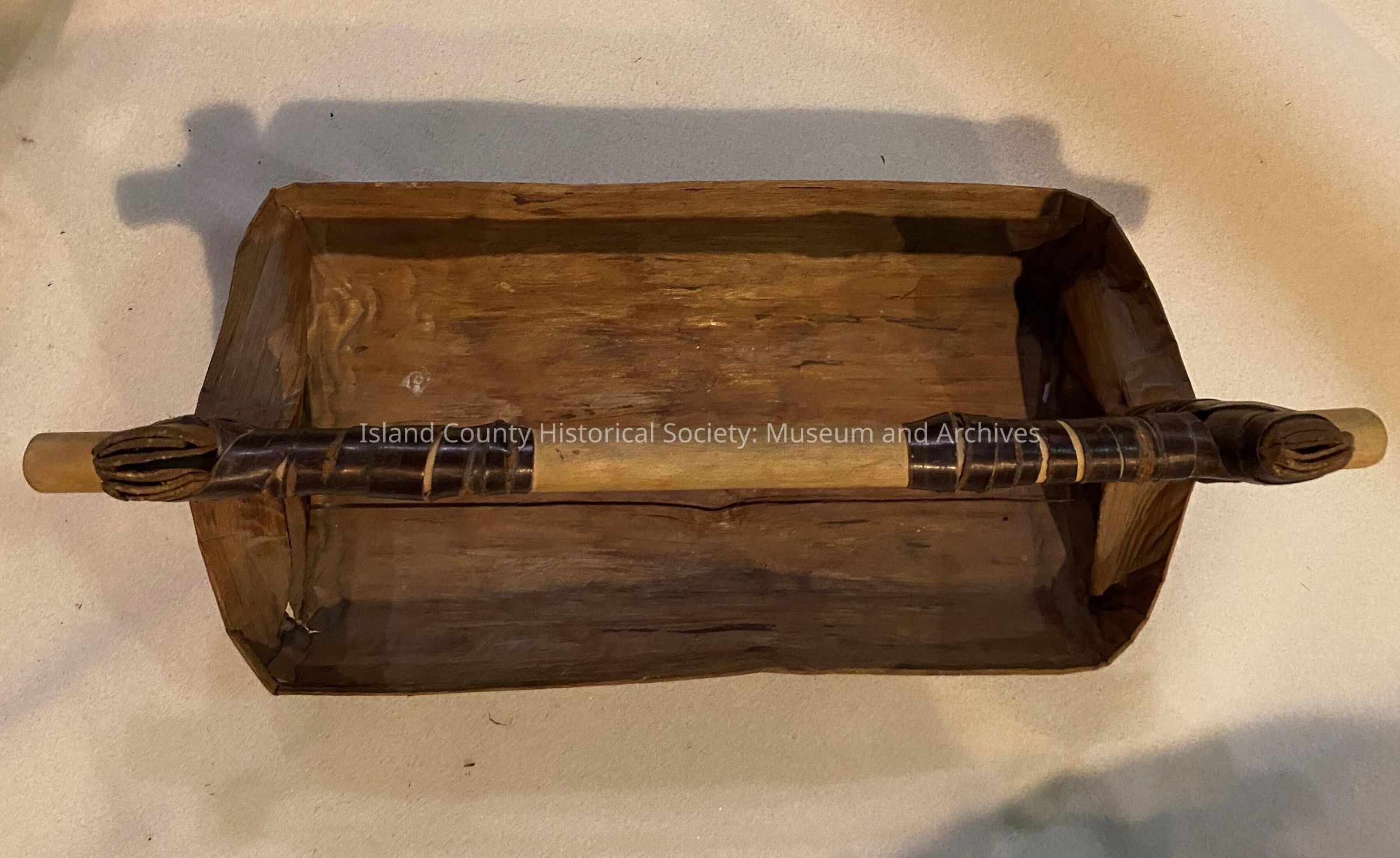 Canoe bailer made of wood (possibly Birch bark). Steamed into a curved basket, ends are tucked, half cylinder shape, handle attatched w/ dark bark, bark is held by metal tacks. c.1930