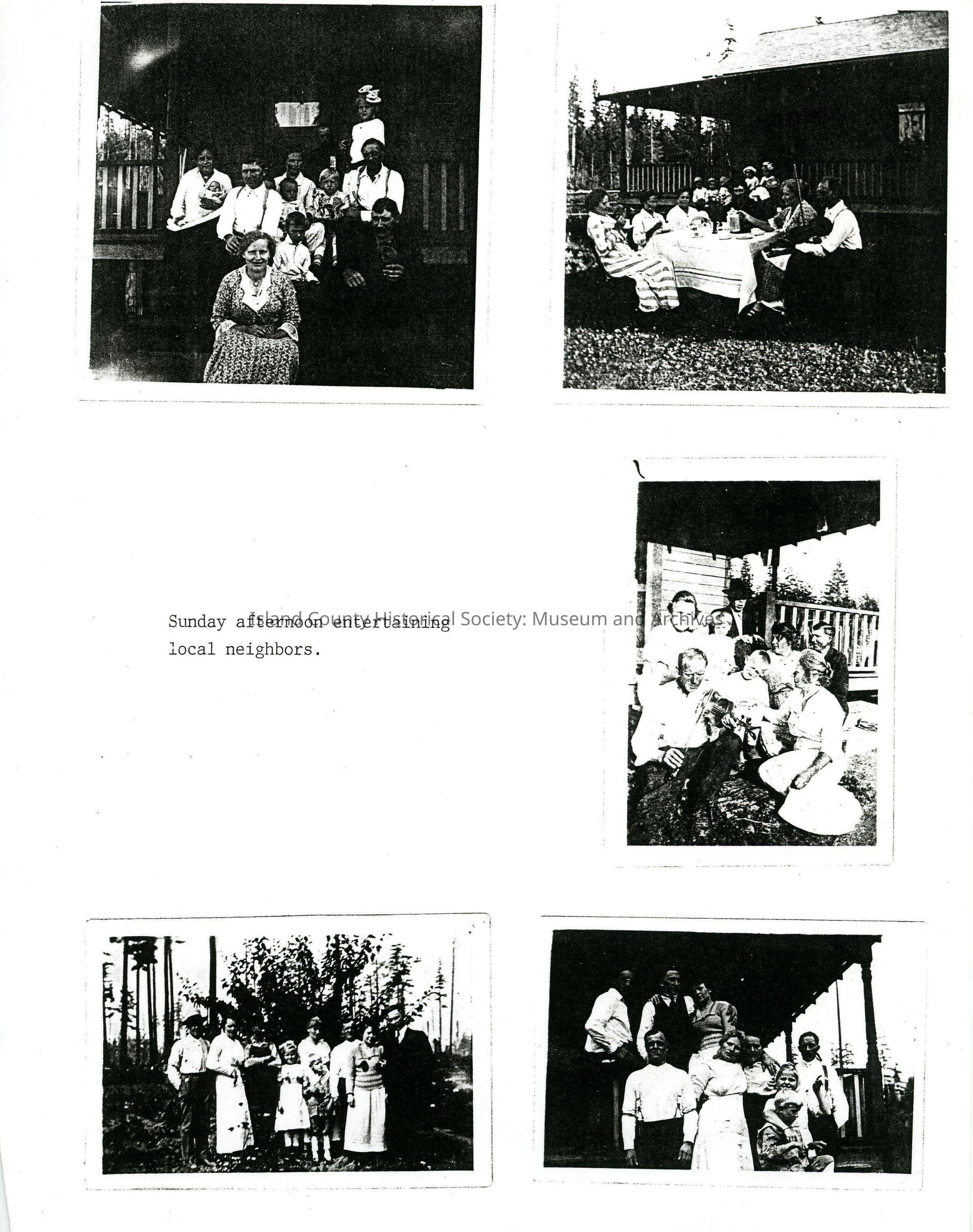 Photocopy of page with five photographs with one small caption. Includes families gathered together in each shot, e.g. sitting eating outside on a table, one of them crowded on a porch and one in which a man holds a violin (fiddle/similar string instrument).