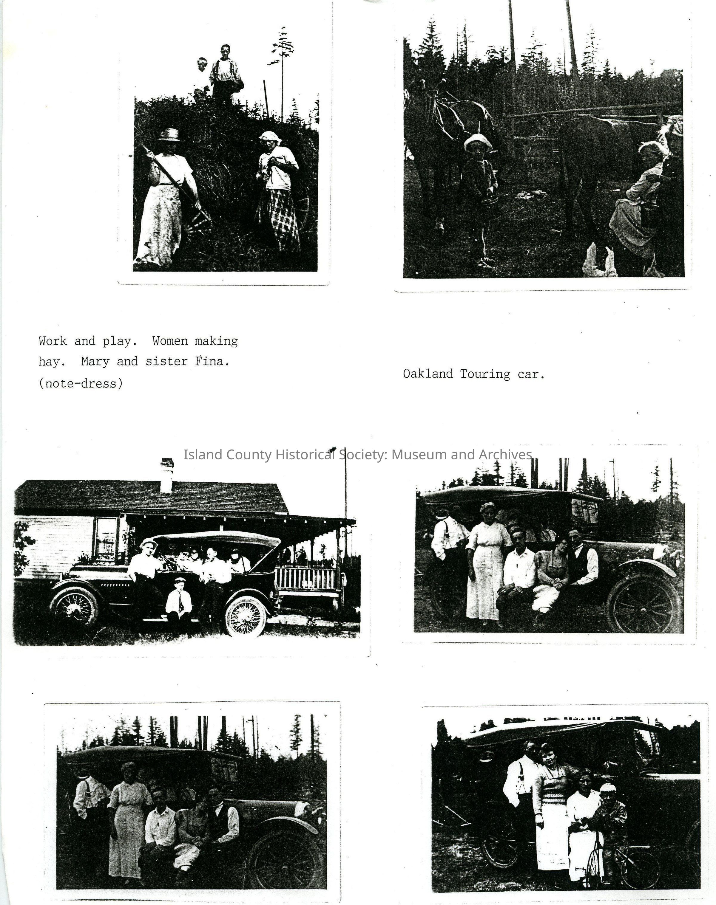 Photocopy of page with six photographs with two small captions. Includes women making hay and photos with an Oakland touring car.