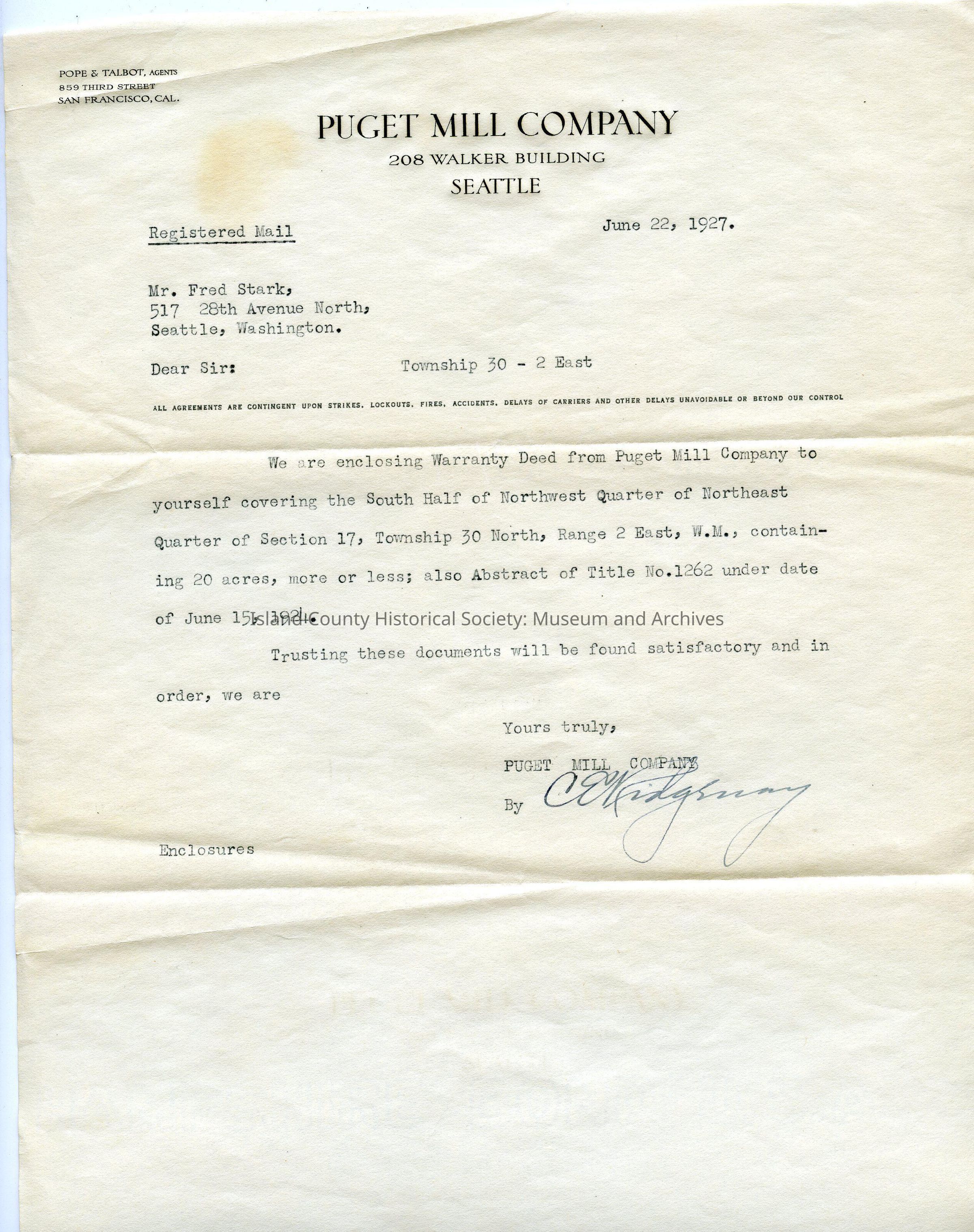 Letter to Fred Stark from the Puget Mill Company dated June 22 1927 stating that they have enclosed a warranty deed to a plot of land he purchased (see 2017.028.063).