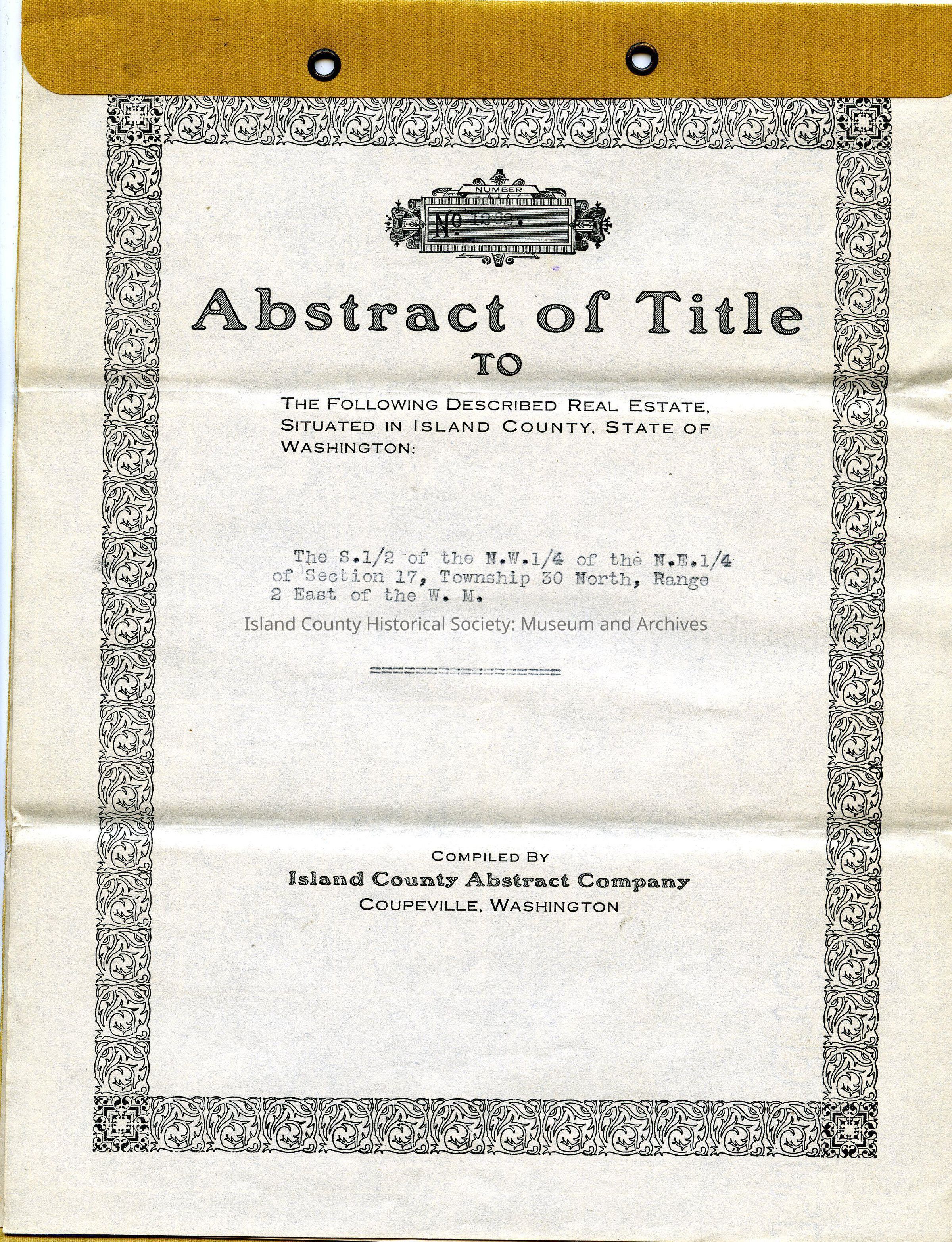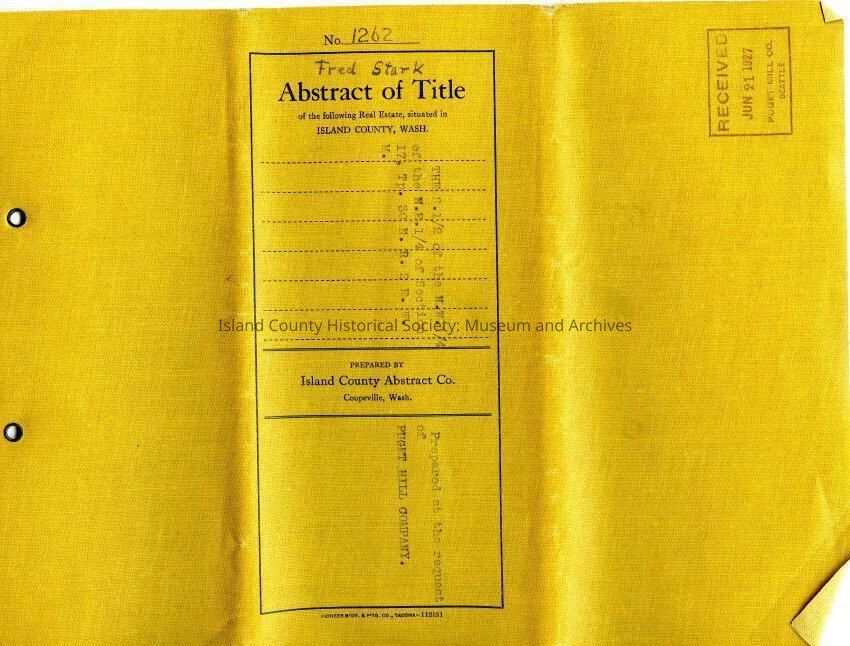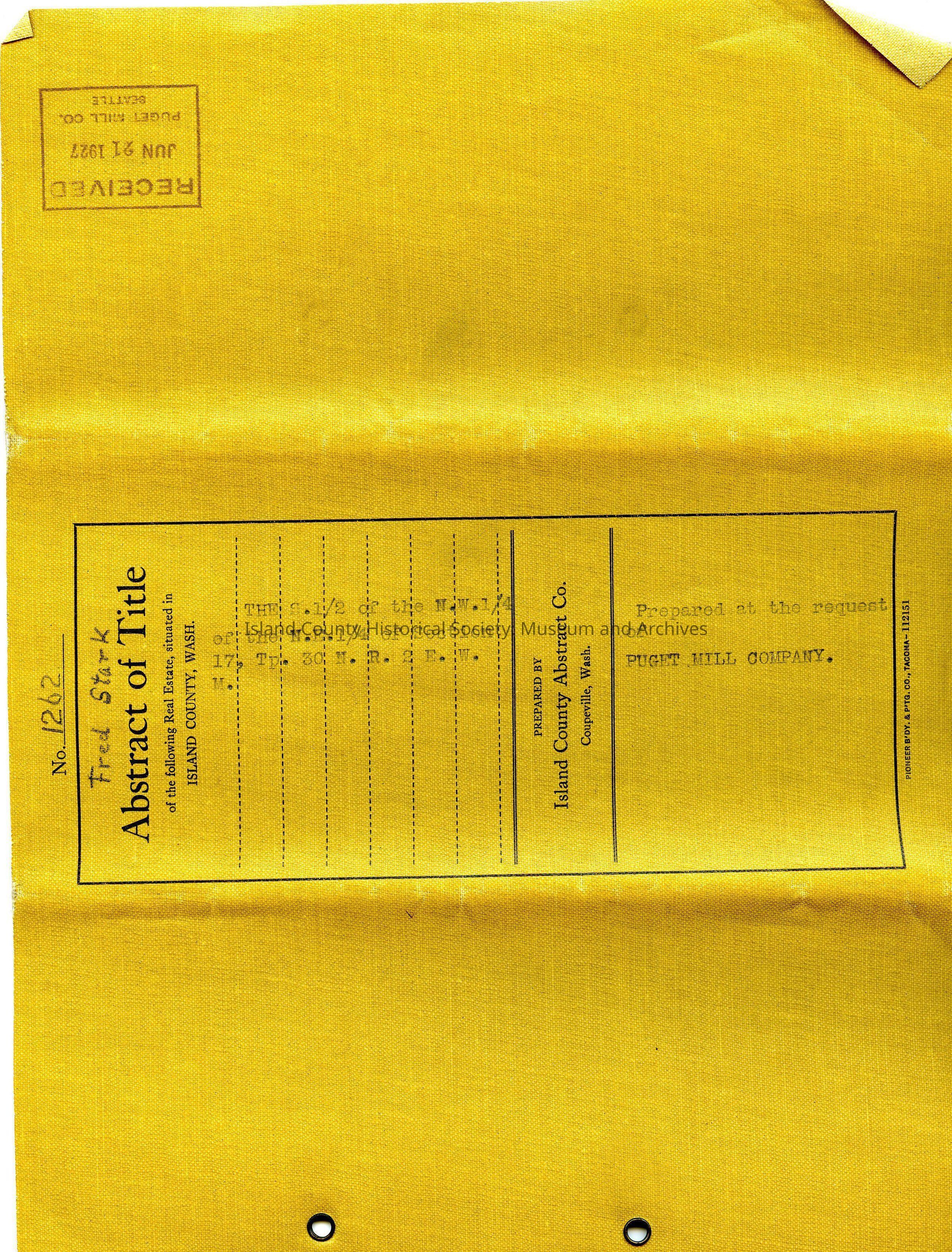 Abstract of title to land property with dark yellow cover and two eyelets at the top. Back of cover stamped by Puget Mill Company as "received". 8 pages not including cover. Shows blue scaled map of land property coordinates. Each page details previous owners of the land starting from 1877 up to Fred Stark. Made by Island County Abstract Company for the Puget Mill Co.