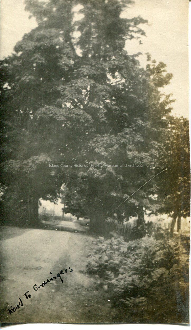 A black and white photo of a dirt road. There are large trees on either side of the road. The bottom of the photo says, "Road to Graingers".
