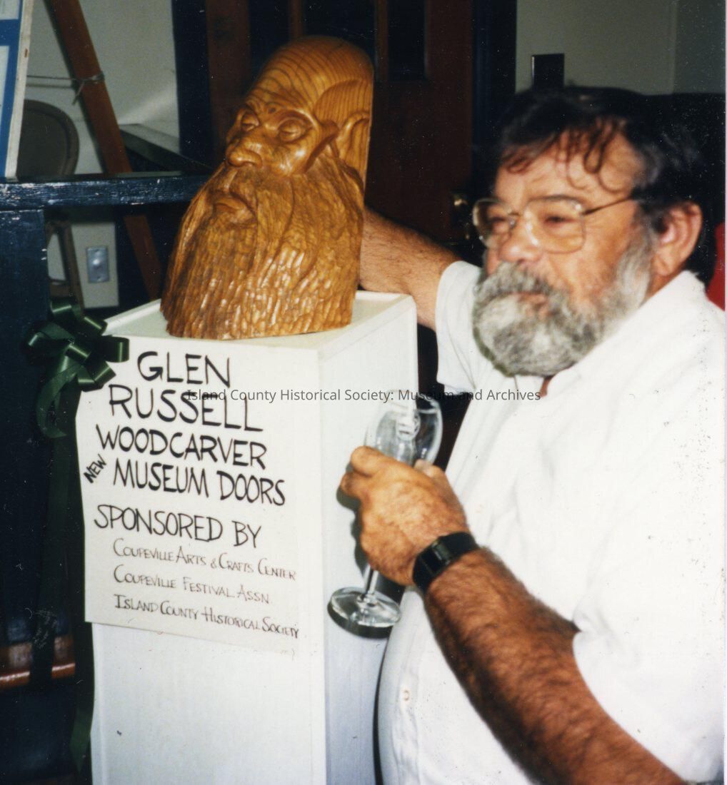 A photo of a man showing a wooden head he carved. It says "Glen Russell Woodcarver New Museum Doors." Handwritten on the plastic cover is "Del Bennett." This is a colored print.