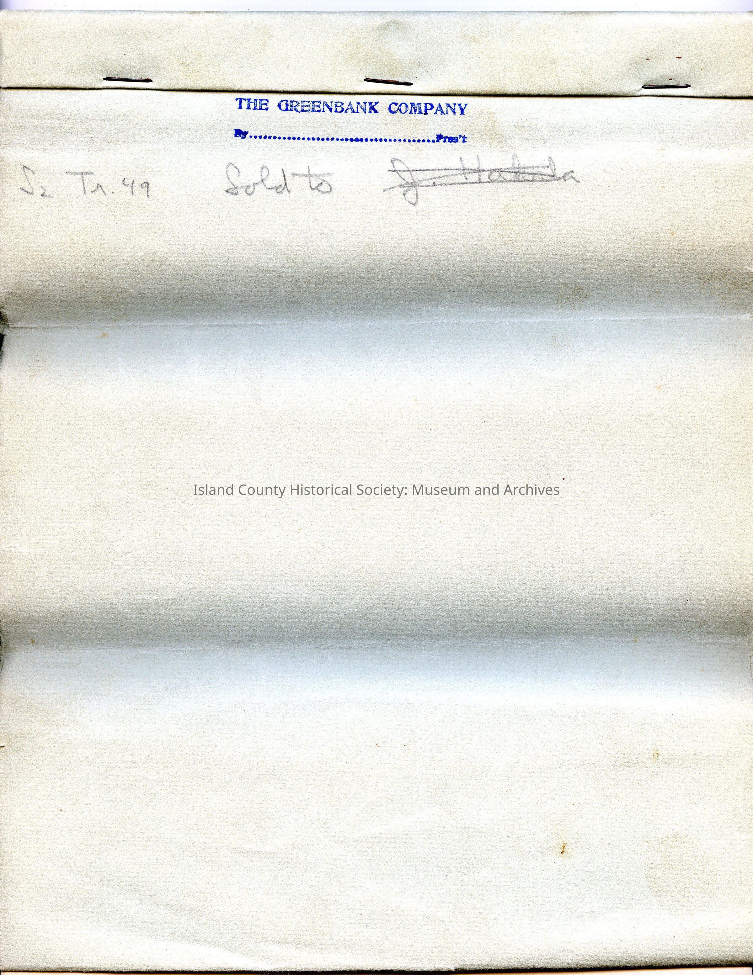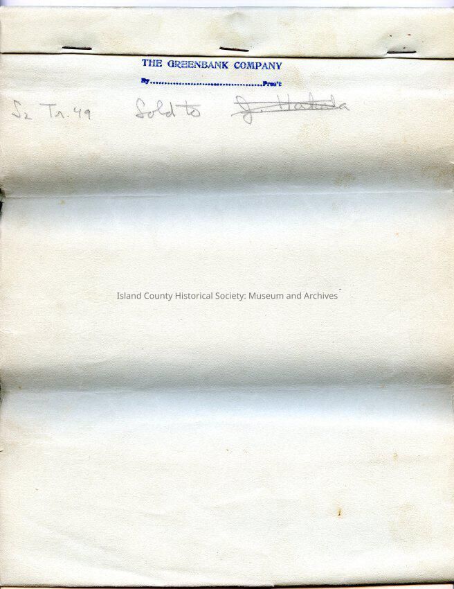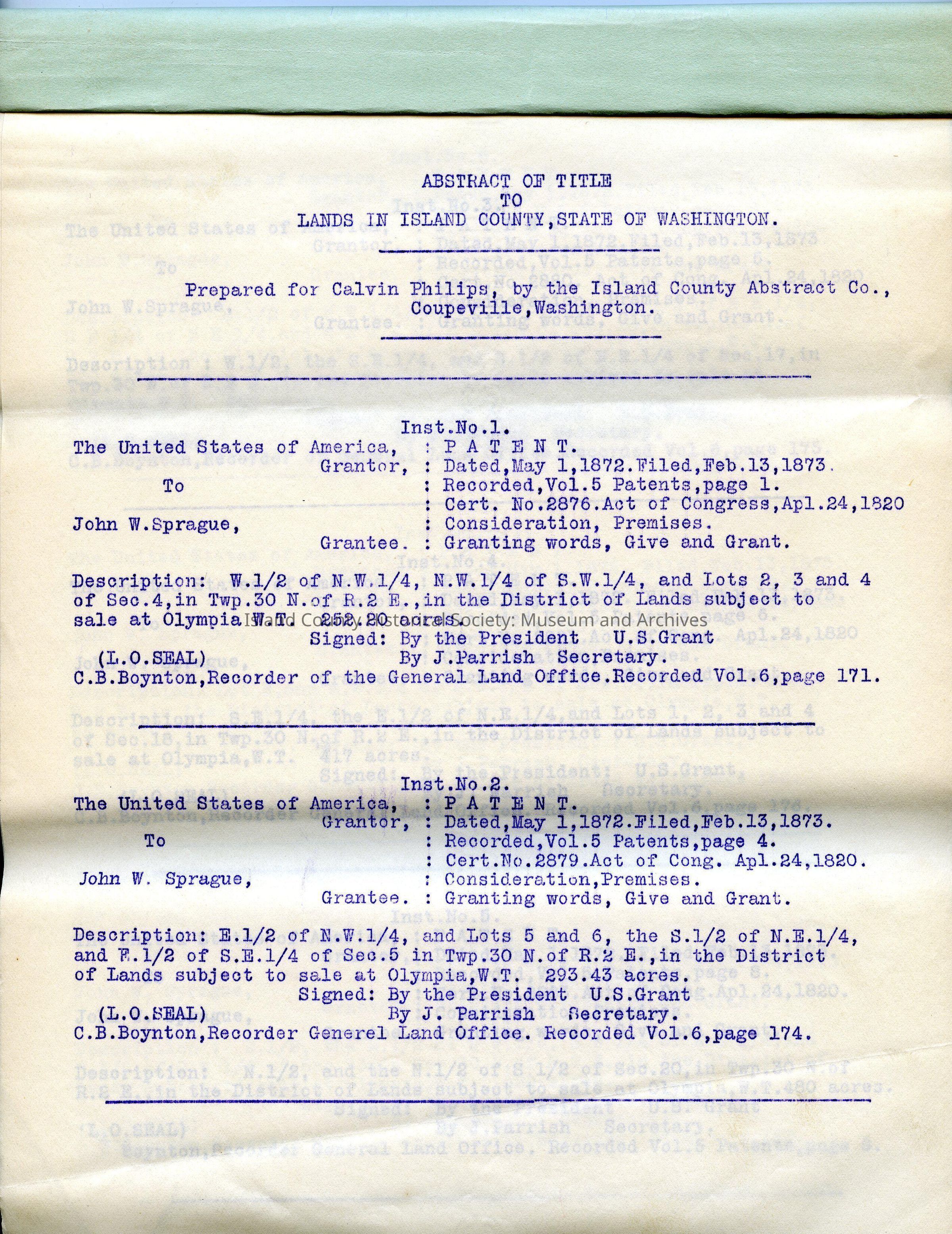 Abstract of Title Lands in Island County. Cover is faded robin blue and held together by three staples. 67 pages not including the covers. Details previous owners of land space and any legal disputes concerning the land (mortgages, ownership, etc.)