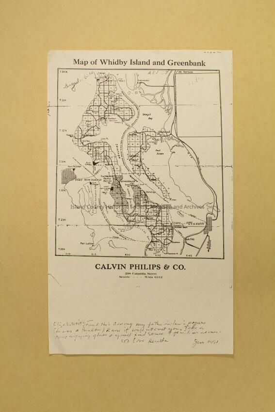 Photocopy of Map of Whidby (sic) Island and Greenbank produced by Calvin Philips & Co. Below map is a note dated 1991 from Herelta(?) saying where she found this and thought it might be pique the interest of who she addressed (unknown). See 2017.028.006. Identical to 2017.028.072.
