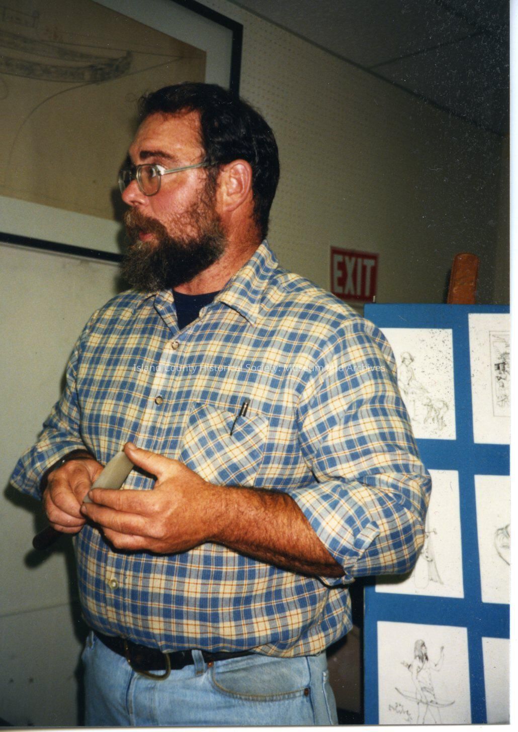 A photo of Glen Russell. On the back it says "Glen Russell explains museum door carving project."