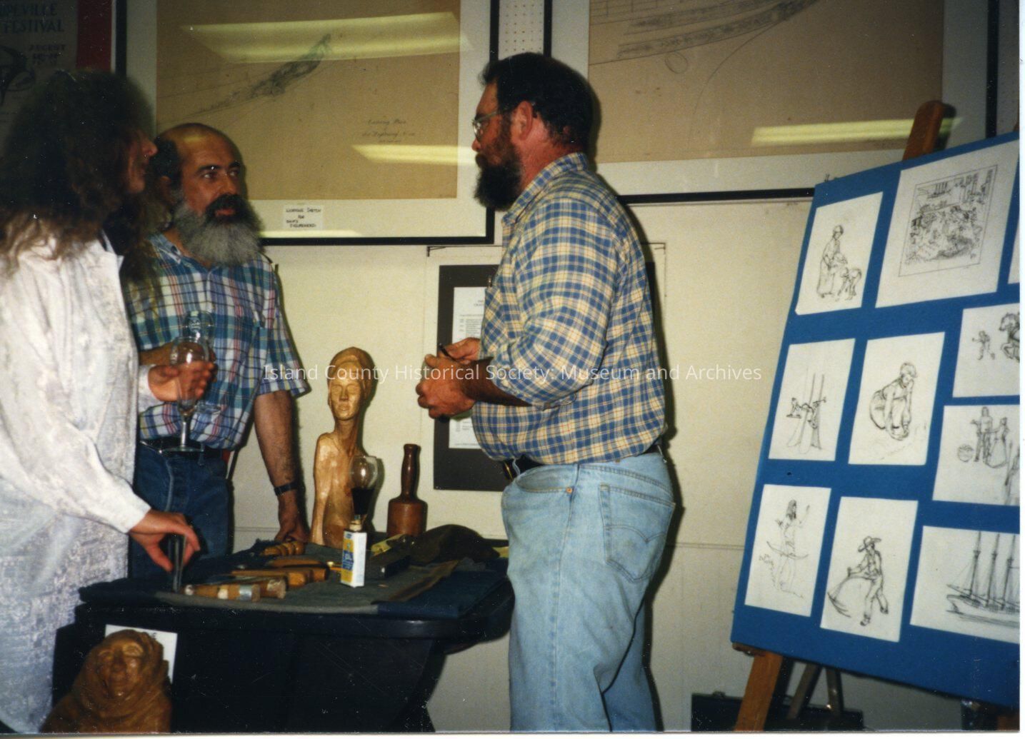 A photo of Glen Russell talking to a man and woman over a desk. There is an easle n the right with drawings on it. This is a colored print.