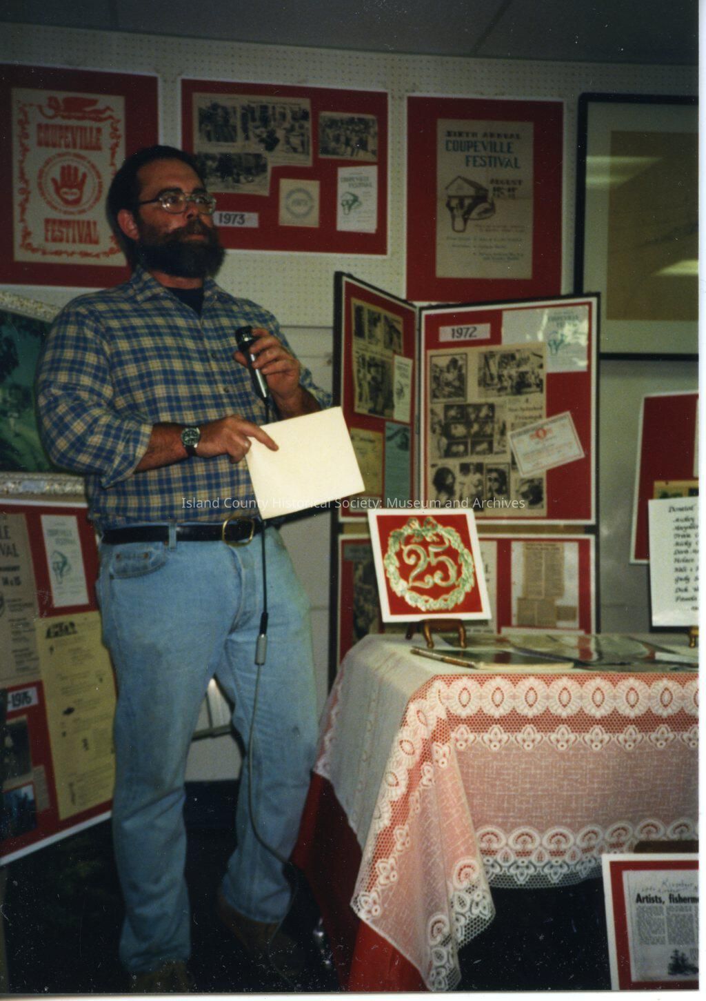 A photo of Glen Russell talking and showing a drawing (?) near a table with a red and white card that shows '25' on it.