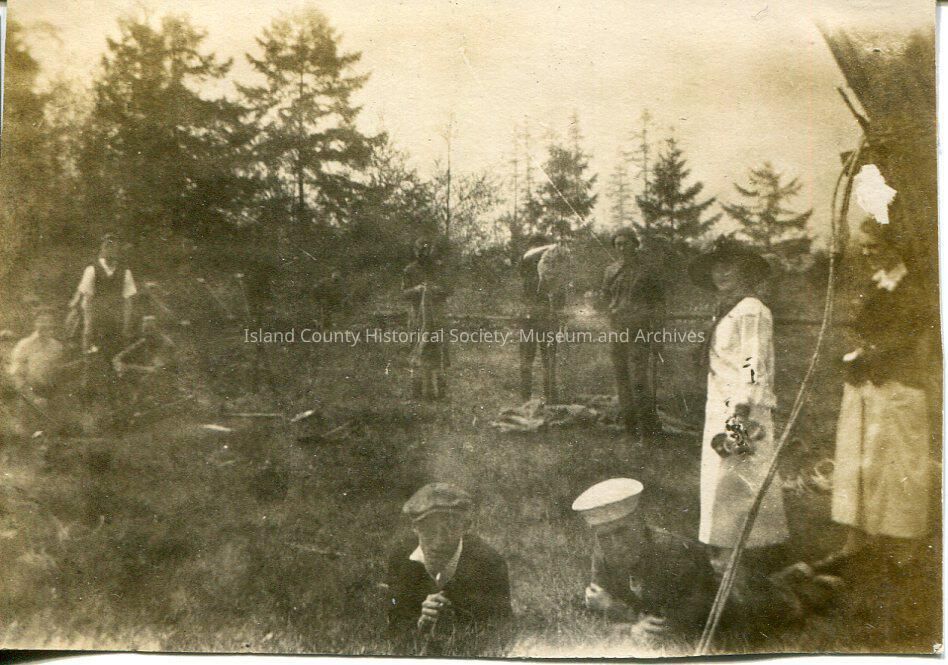 A black and white photo of a group of people outside. The photo is blurry but there are about 12 people present. The photo was taken in an open area/field. There are trees in the background.