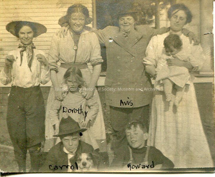 A black and white photo of a group of people. There are 8 people and one dog pictured. The woman on the far right of the photo is holding a baby. The child on the bottom left side of the photo has a dog on their lap. There is a house in the background. The names of some of the people on written on front of the photo; the names are, "Avis, Dorothy, Carrol, Howard". KelloggLexicon