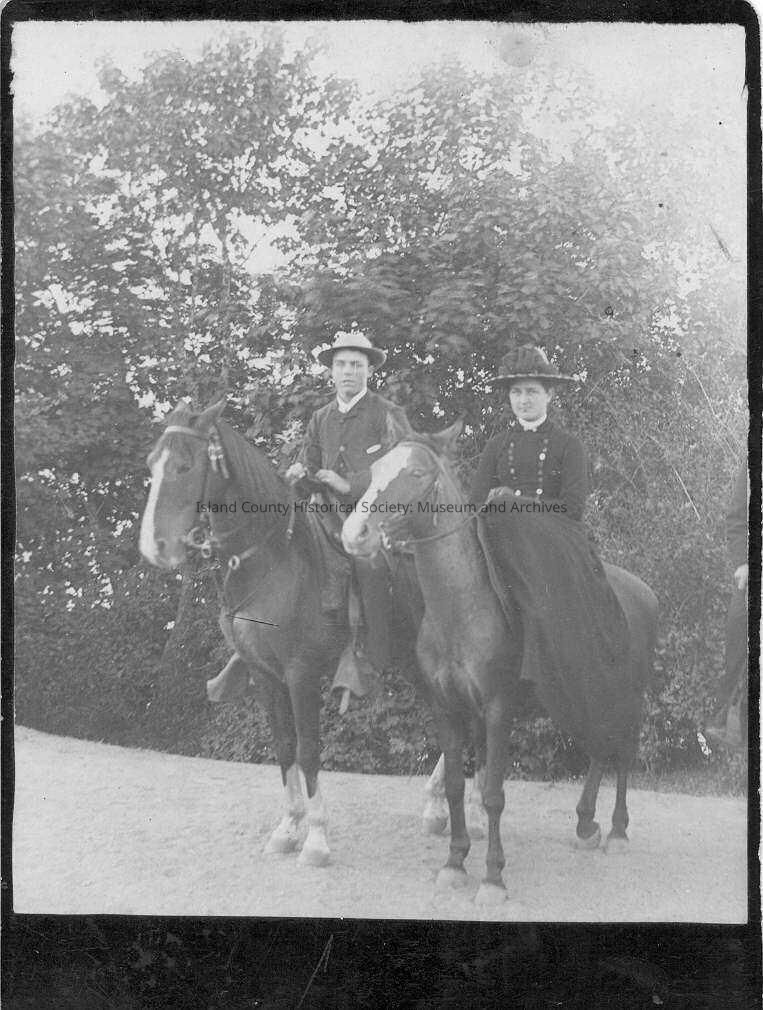 Man and woman on horses. "Straub" written on back of the photograph.