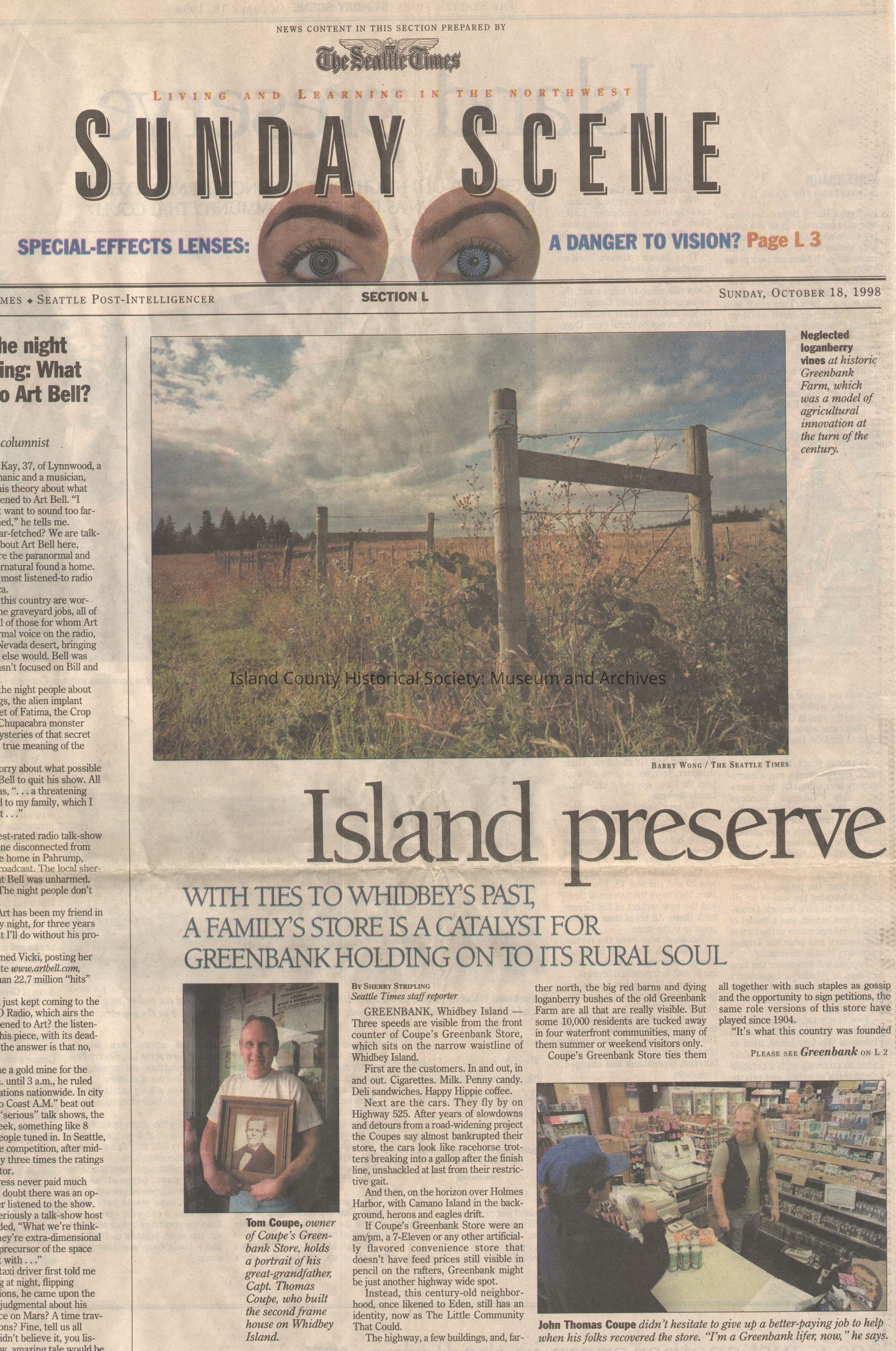 Newspaper article "Island Preserve" in The Seattle Times Sunday Scene Section L October 18 1998. Written by Sherry Stripling. About Coupe's Greenbank Store and surrounding area- saving of Greenbank Farm, life of owner John Thomas Coupe. (.082a and b- two sheets of paper, b inside a).