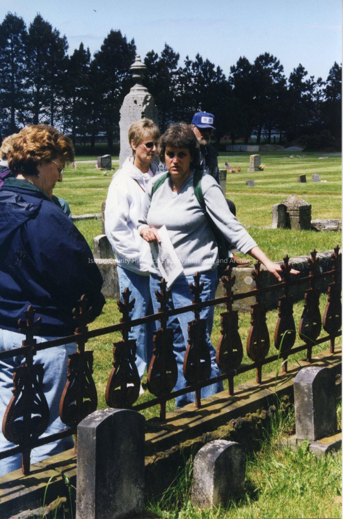 A photo of several women standing at a short fence in a graveyard.