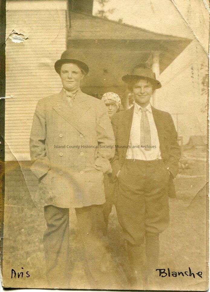 A black and white photo of a two young women. They are standing side-by-side and smiling at the camera. Part of a third woman is visible between them. The girls are both wearing slacks, suit jackets, ties and hats. They are both standing with their hands in their pockets. There is a house visible in the background. The bottom of the photo says, "Avis, Blanche".Lexicon
