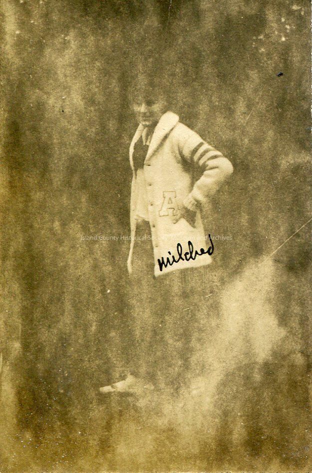 A blurry photo of a woman wearing a letter-jacket. She has her hands on her hips and is smiling at the camera. The bottom of the photo says, "Mildred".