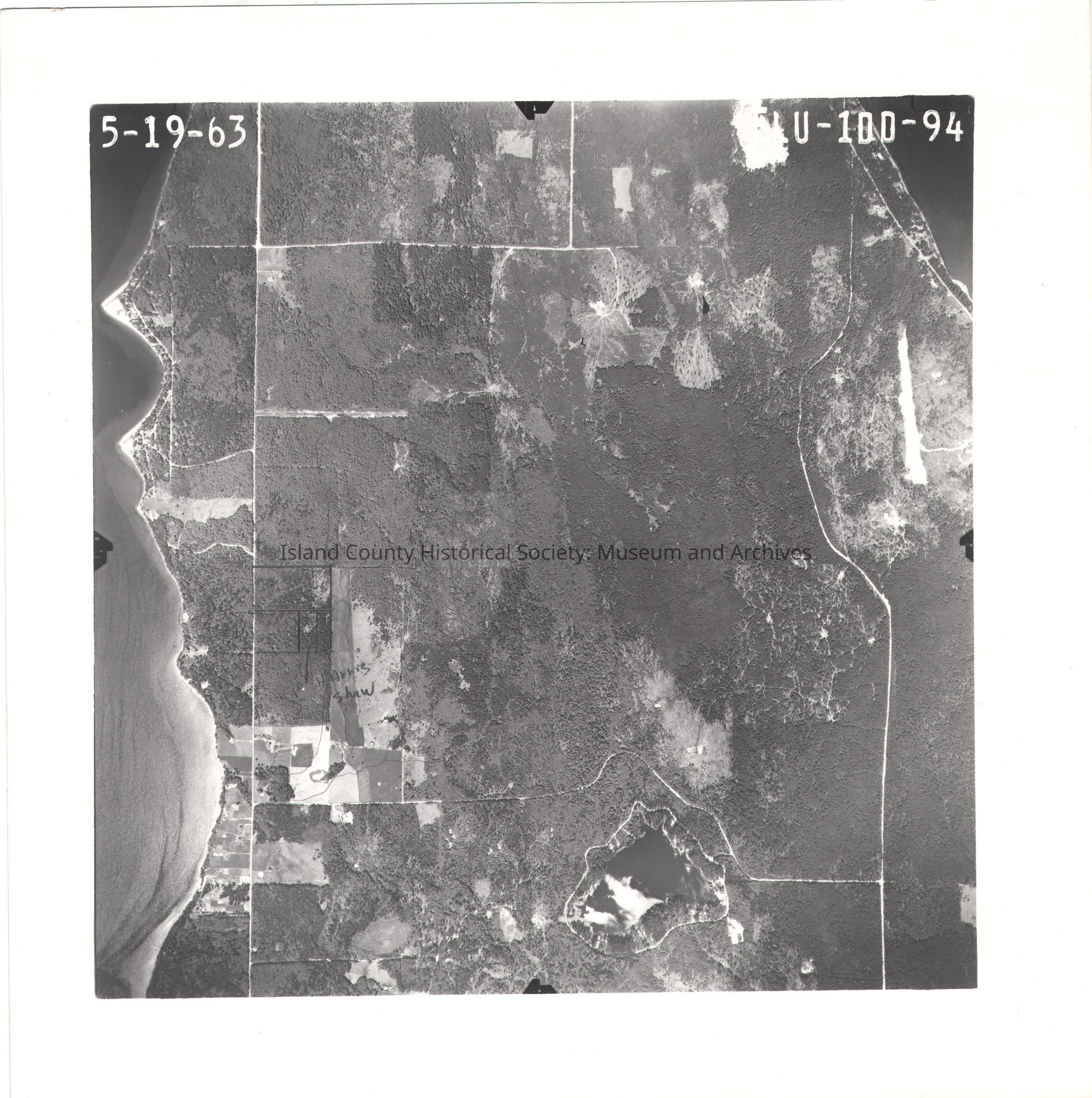 Donated by Island Conservation Adjacent to 2015.023.241 and .243 5-19-63 ELU-1DD-94 Photo taken 19 May 1963 Beverly Beach (east part of Holmes Harbor) Wood Landing Strip Pencil lines on left part of land, HARRIS SHAW See GIS for digital copies.