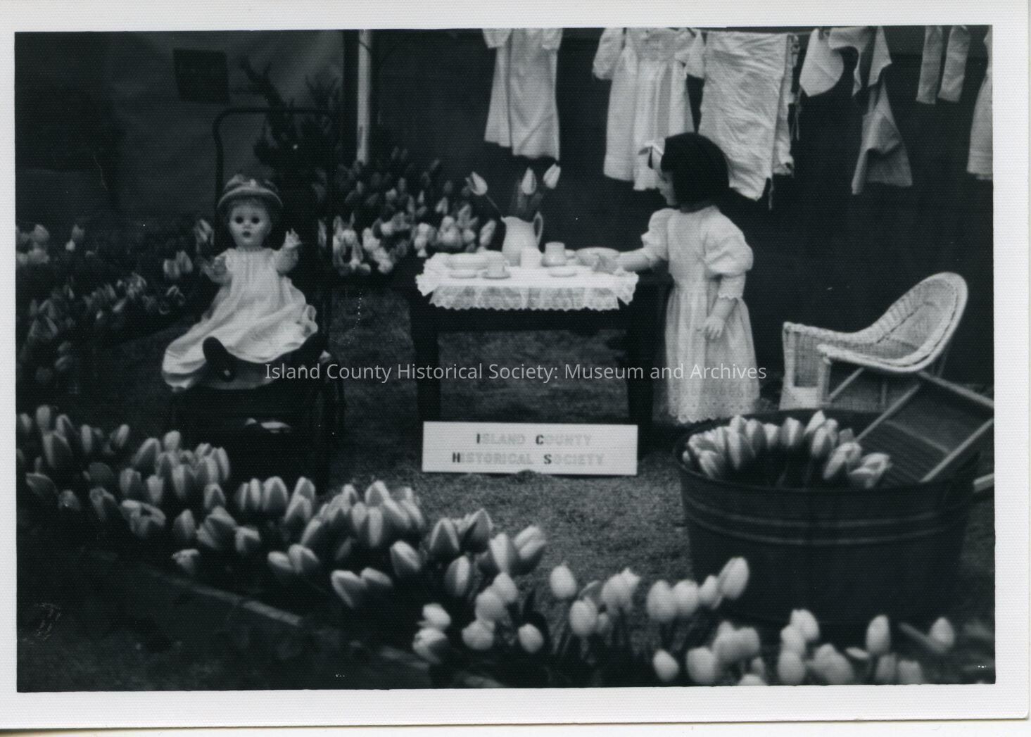 A photo of two dolls having a tea party with what looks like tulips around them.