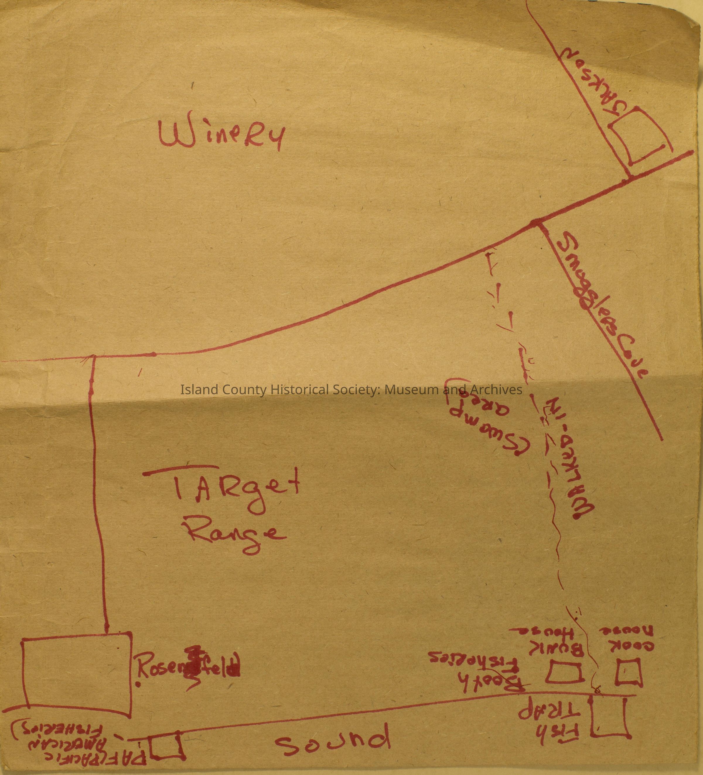 Hand-drawn map of Smugglers Cove, portion of Whidbey Island. Map in red felt tip on back of thick paper bag. Shows winery, Target Range, Smugglers' Cove and neighboring houses and fisheries.