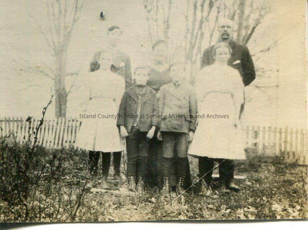 A black and white photo of a group of people outside. There are seven people total; an adult couple, two young girls and three young boys. They are posing for the photo in front of a short, white fence.