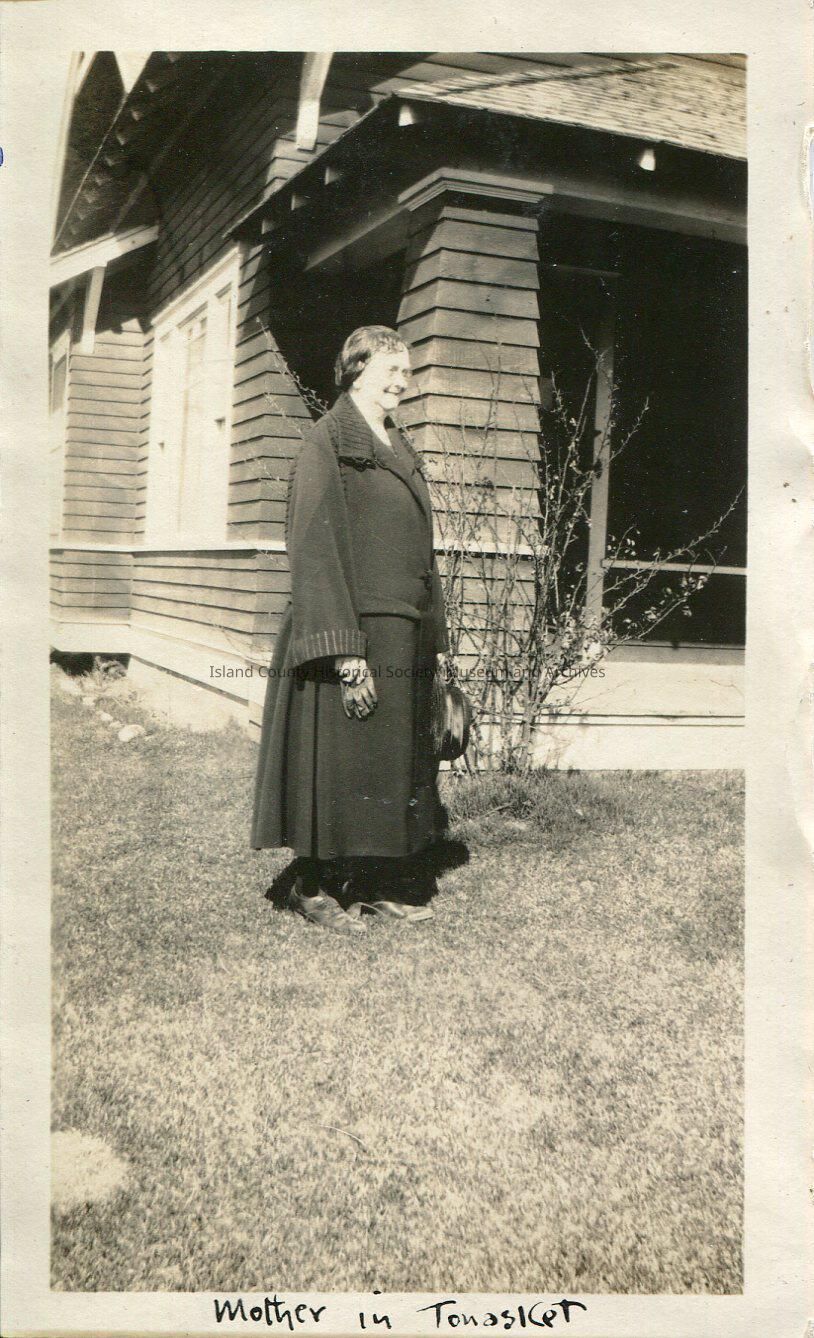 A photo of an older woman standing outside, near a house. She is wearing a long jacket and has her hair pulled back. She is not looking at the camera but smiling. The bottom of the photo says, "Mother in Tonasket". The back of the photo says, "Tonasket, Wash. Mrs. Claudia's home. Lillian Butters Kellogg. George's mother".Lexicon