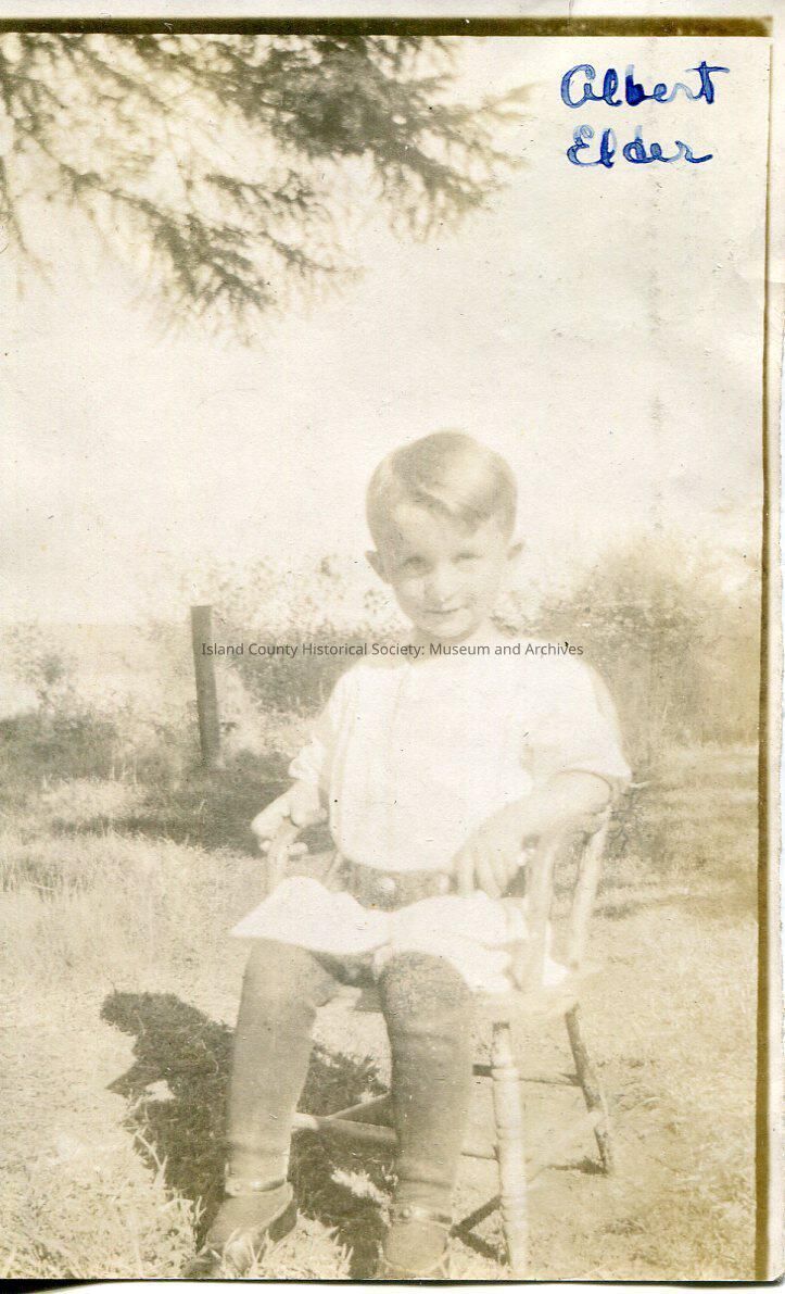 A young boy sits on a chair in a garden. The young boy has light-coloured hair with pointy ears and he wears a white loose tunic with a studded belt. He has thick darker leggings and flat shoes. The chair is wooden, worked, and with armrests where he places his arms and hands. Tree branches and leaves hang over-head in the upper left corner. He is surrounded by grass and bushes.