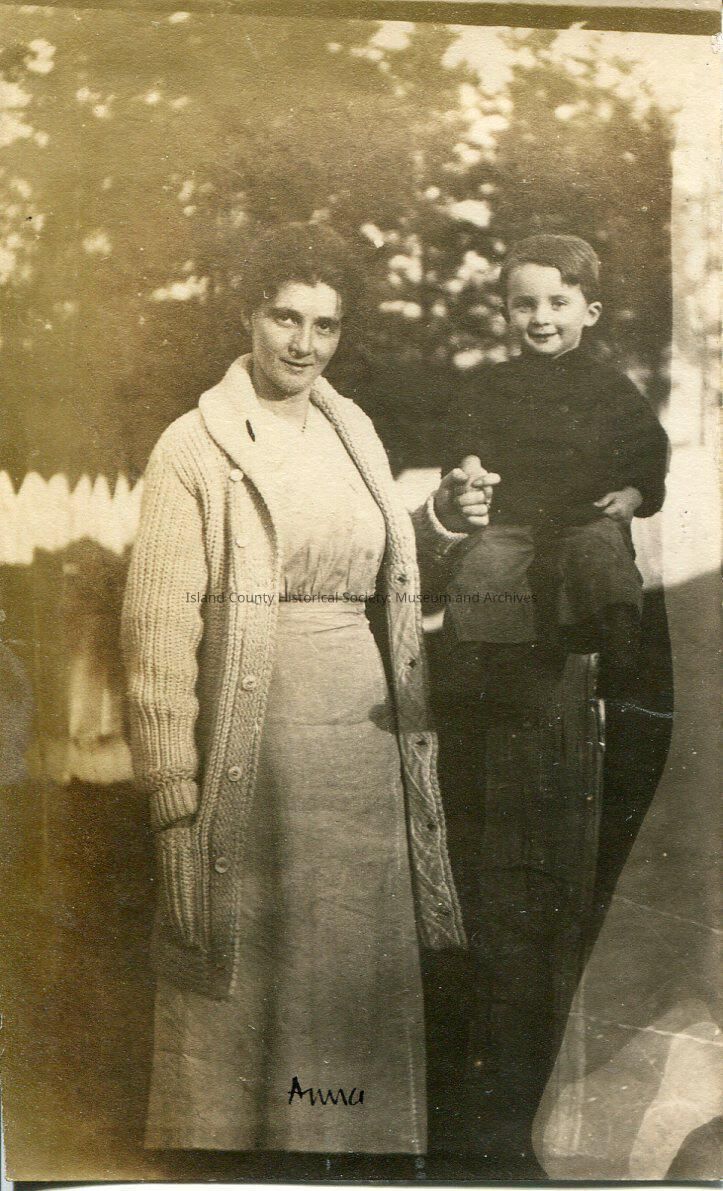 A woman and young boy. Written in black ink at the bottom is "Anna". The woman appears to be in her thirties-forties. She has a sturdy frame, aquiline nose and dark hair bound up, with a raven's peak. She is dressed in a long cardigan, open, and with buttons and deep pockets. Underneath she wears a light blouse and skirt/dress that is tighter around her upper waist/under bust. One hand is in her pocket, her other hand holds that of a young boy with short dark hair and clad in dark clothes. He sits on a tall wooden pole, so his head is just a little higher than hers. They appear to be standing in a garden and what is possibly a white picket fence behind them and tall thin trees.Made/Created