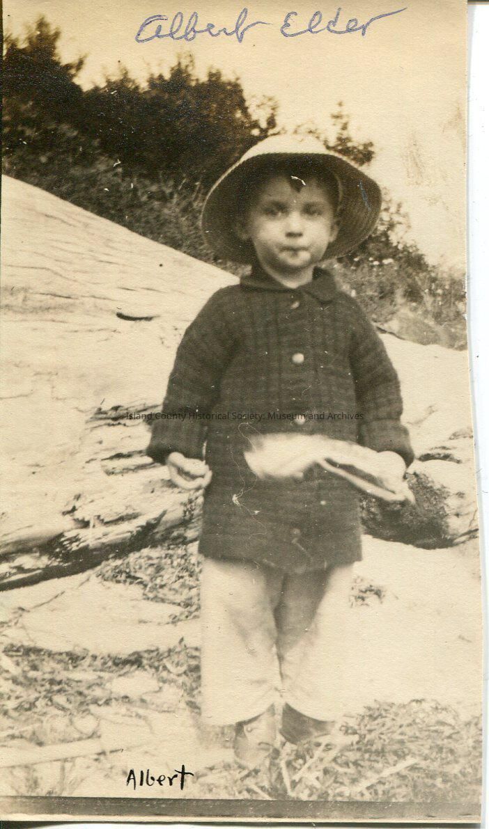 Image of young boy. In the middle of the top is written "Albert Elder" in blue biro pen. Below in the middle in black ink is "Albert:. The boy pinches his lips, making a puckered expression. His dark hair is mostly covered by a wide brimmed hat. His coat is checked or similarly patterned, dark, buttoned up, collared and long. He wears loose light coloured trousers and boots/shoes. He holds things in his hands. Behind him are trees and logs, and other vegetation and rocks.Made/Created