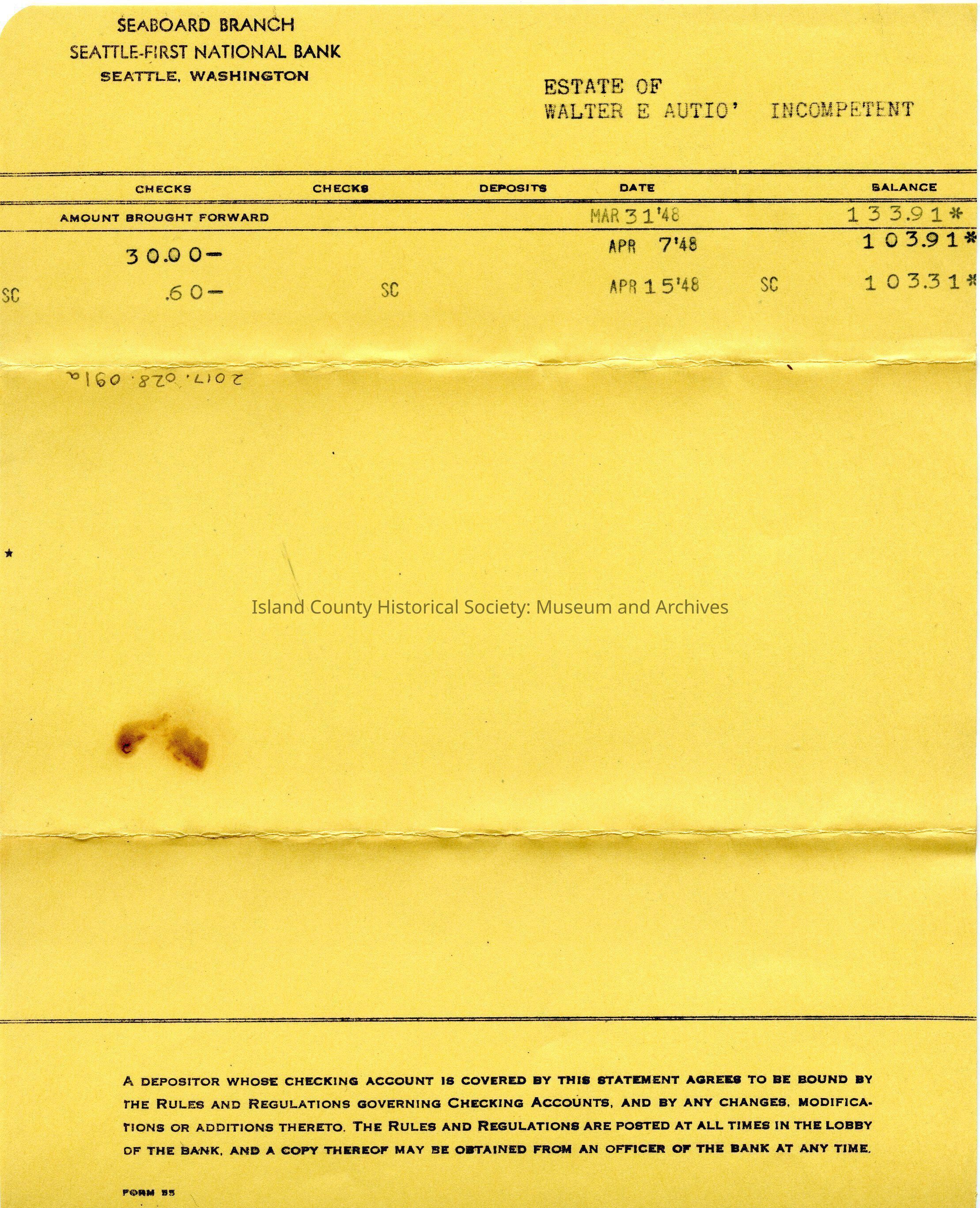 Bank statement for estate of Walter Autio, Seaboard Branch of Seattle First National Bank. March 31 1948 to April 15 1948