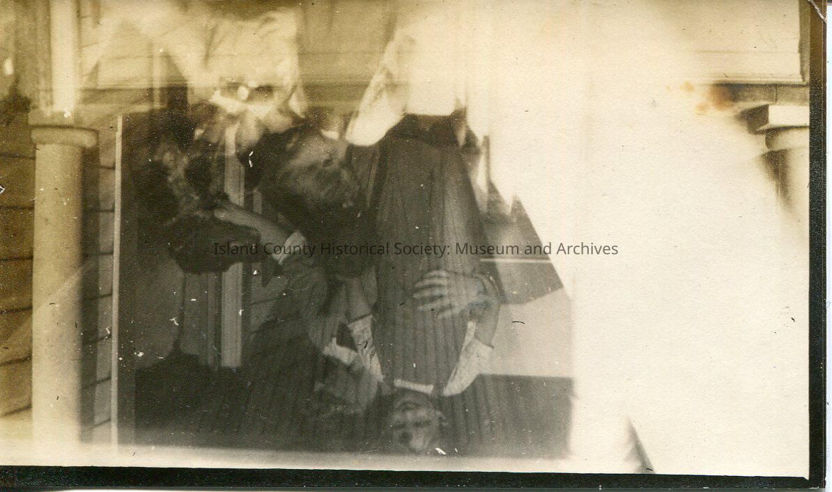 A photo of a woman and a toddler. The woman is bent to the side, petting a dog. With her other arm, the woman is holding onto a toddler. The toddler is wearing overalls and the woman is wearing a blouse with a tie. There is a large light mark on the left-side of the photo. It also appears that the photo is duplicated on the bottom--the woman is in the same position but the boy is looking at the dog instead of the woman. The duplicated part on the bottom is faded and blurry.
