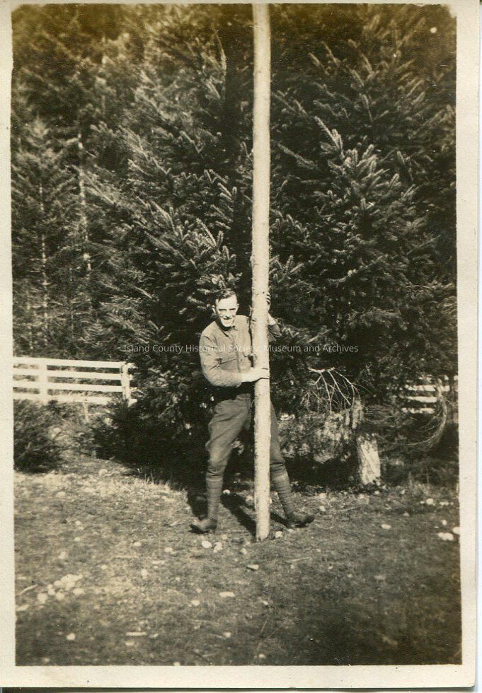 A photo of a man standing outside holding onto a tall, thin and bare tree trunk. There are trees and a fence in the background. The man is smiling at the camera. The back of the photo says, "George getting ready for a pole-vault".