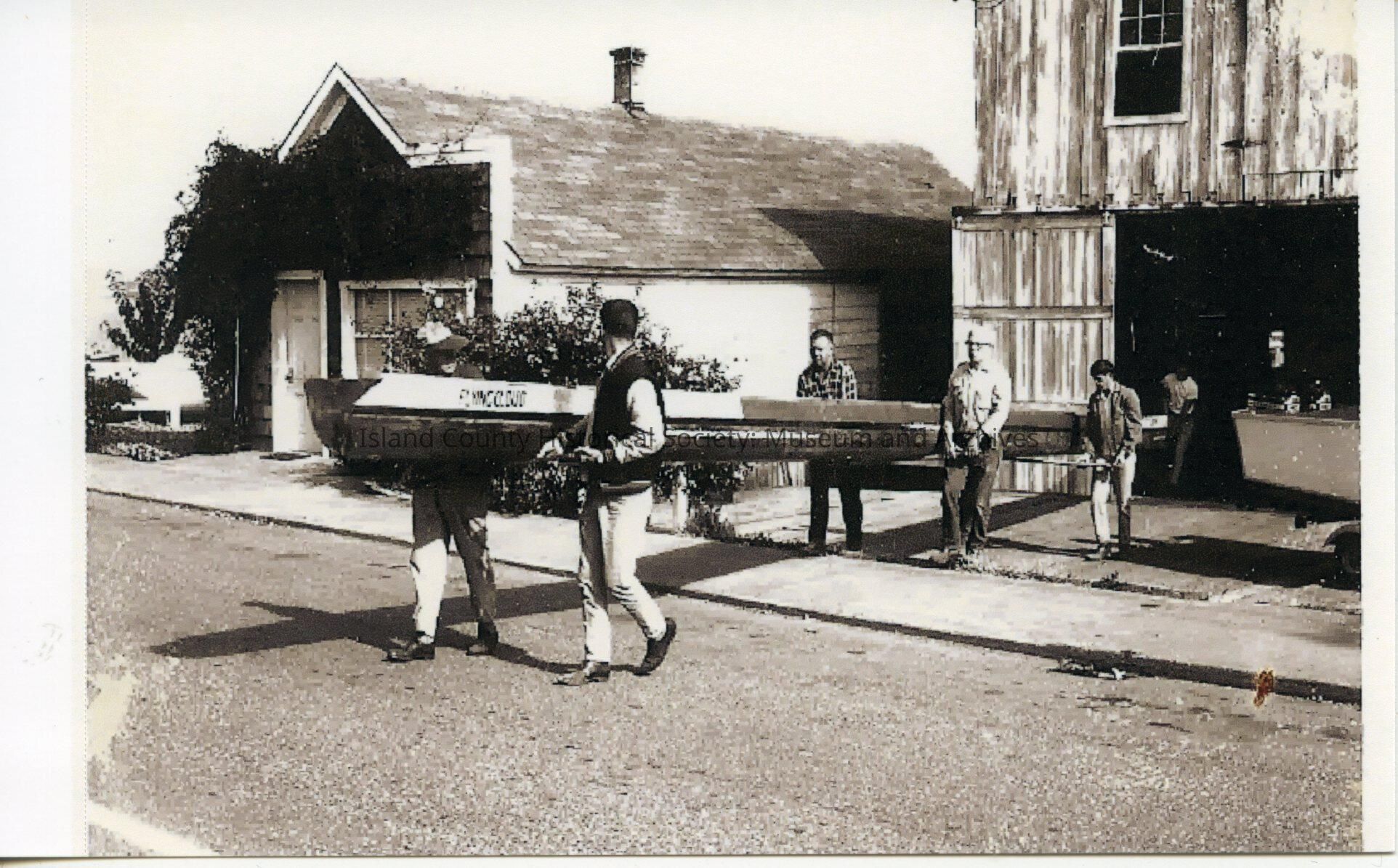 A photo or several men standing and carrying Flying Cloud canoe out of Gillespie's Livery Stable building, Front Street, Coupeville. Bow piece is missing in this photo. Handwritten on the back is the date 1966.
